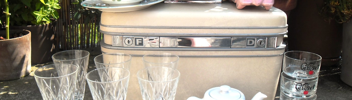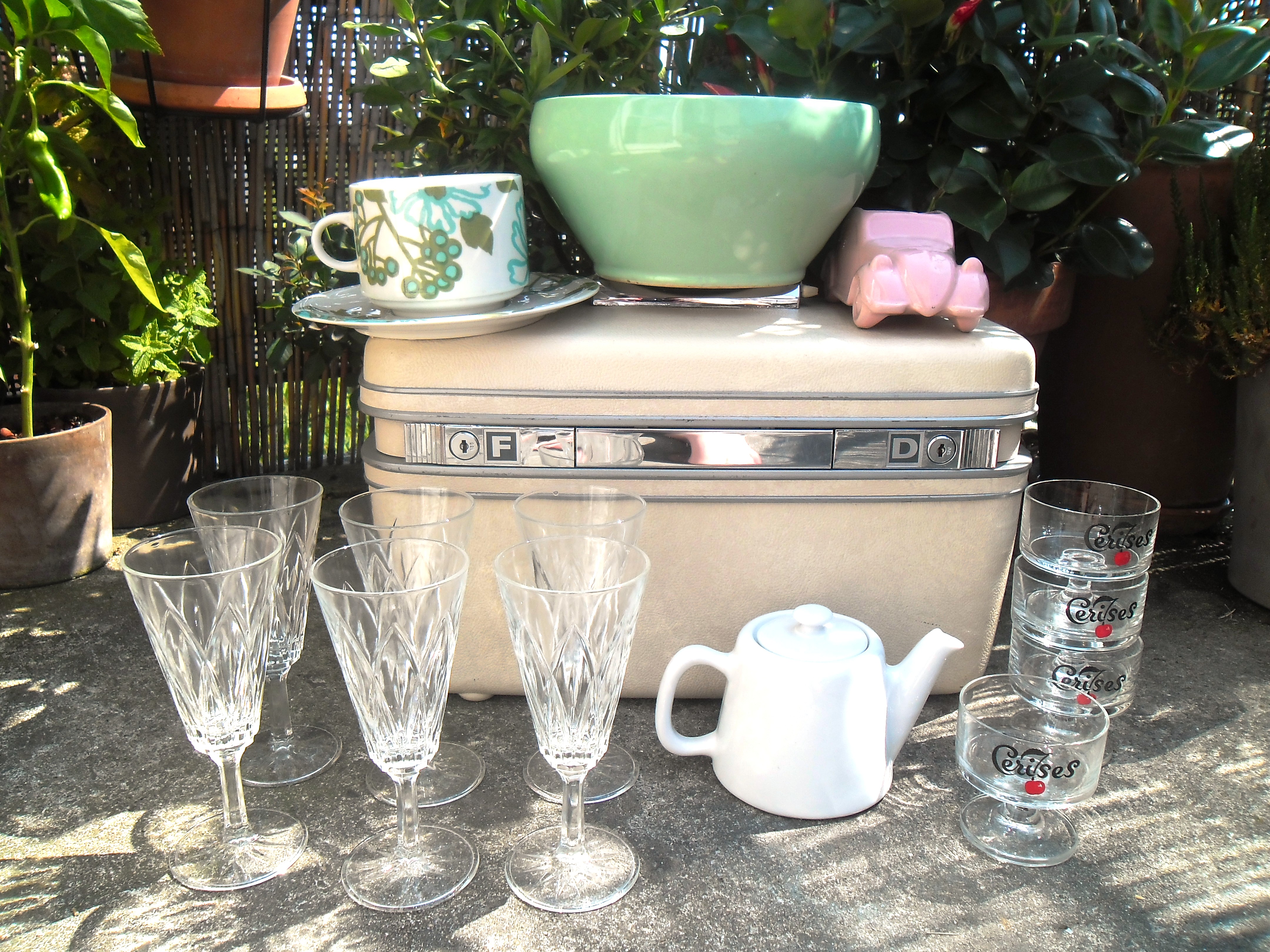 Vintage comme un service à thé et une vanity Samsonite beige. Mint comme un gros cache-pot, rose comme un petit cache-pot à l’allure de « Rolls Royce », et blanc comme une une mini théière. Du verre, des verres, et des verrines … pour des apéros chics et fruités !