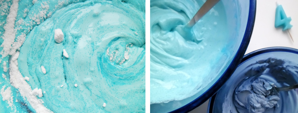 Pour le nappage déco, il faut de la mascarpone, du sucre glace, du colorant, et enfin, du marzipan pour des yeux rigolos.