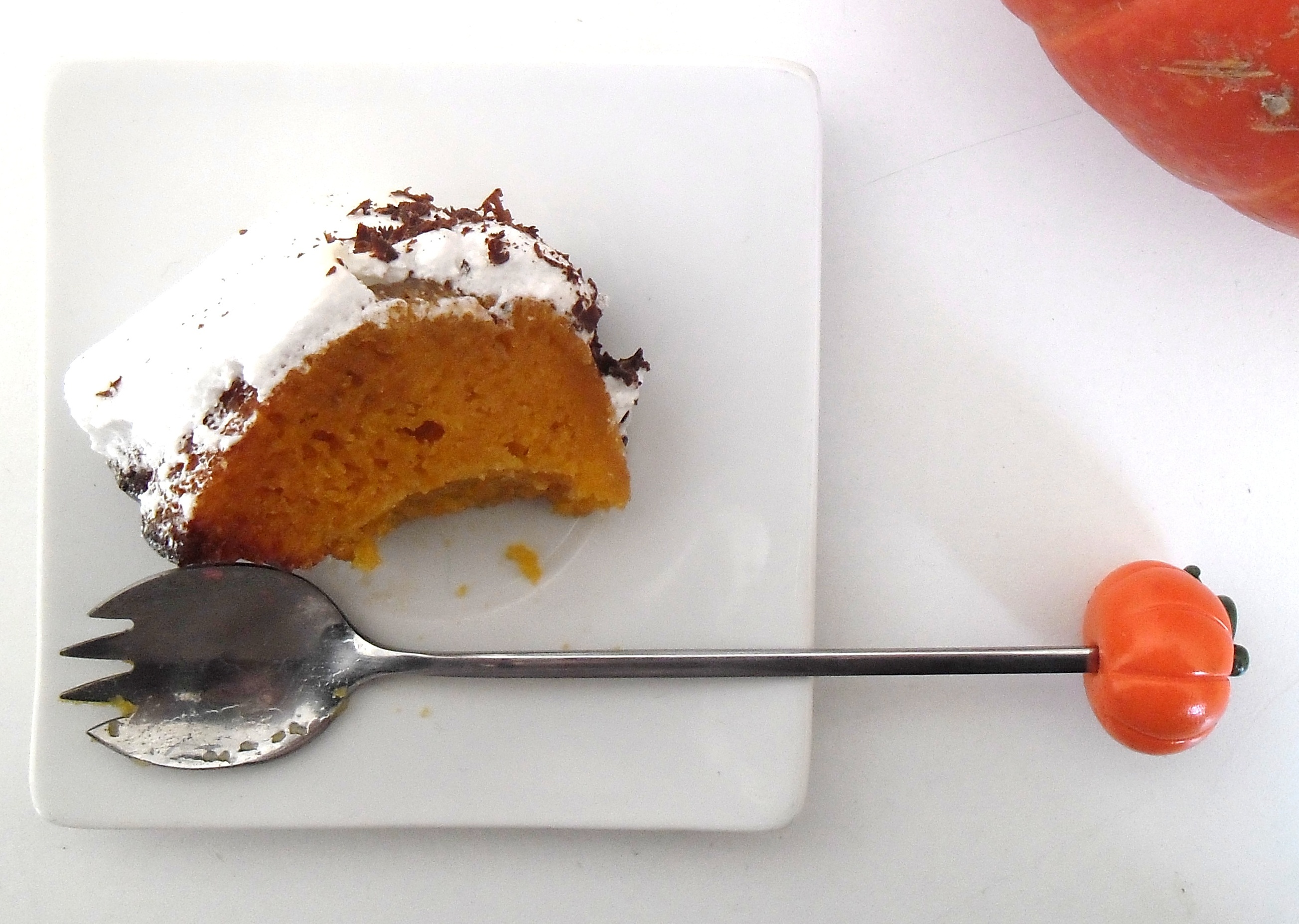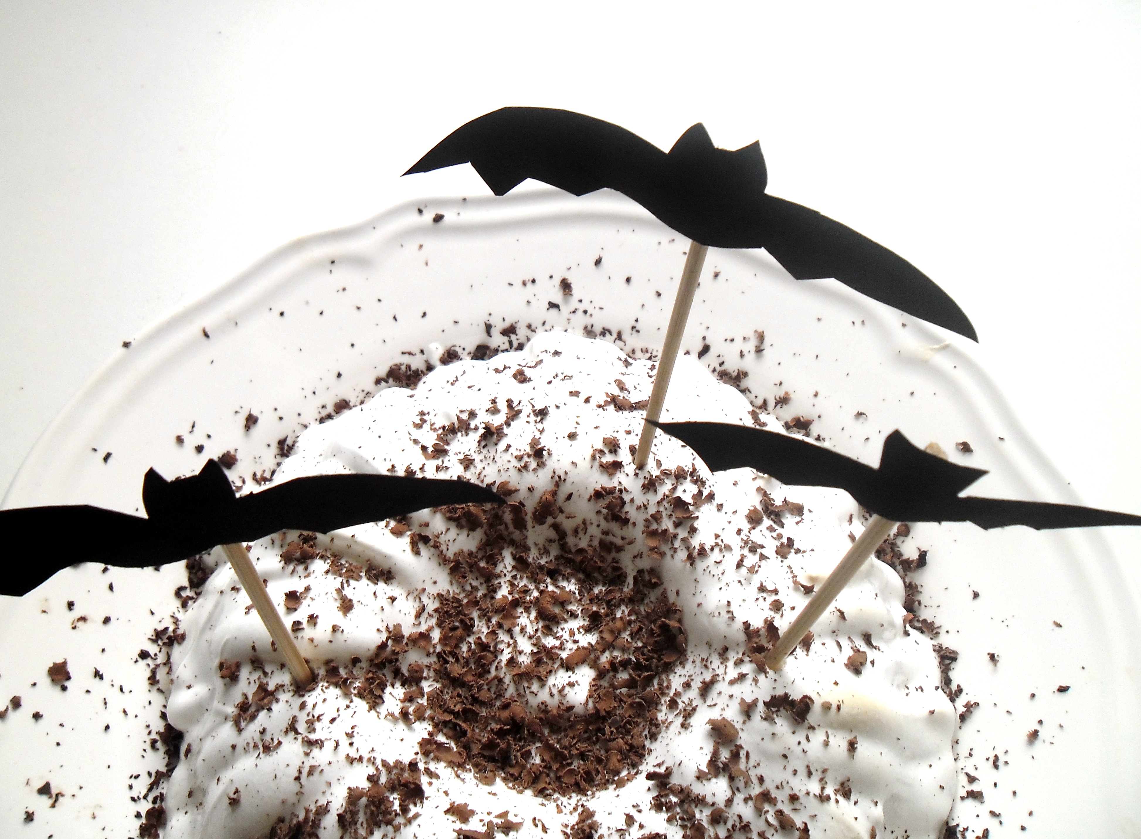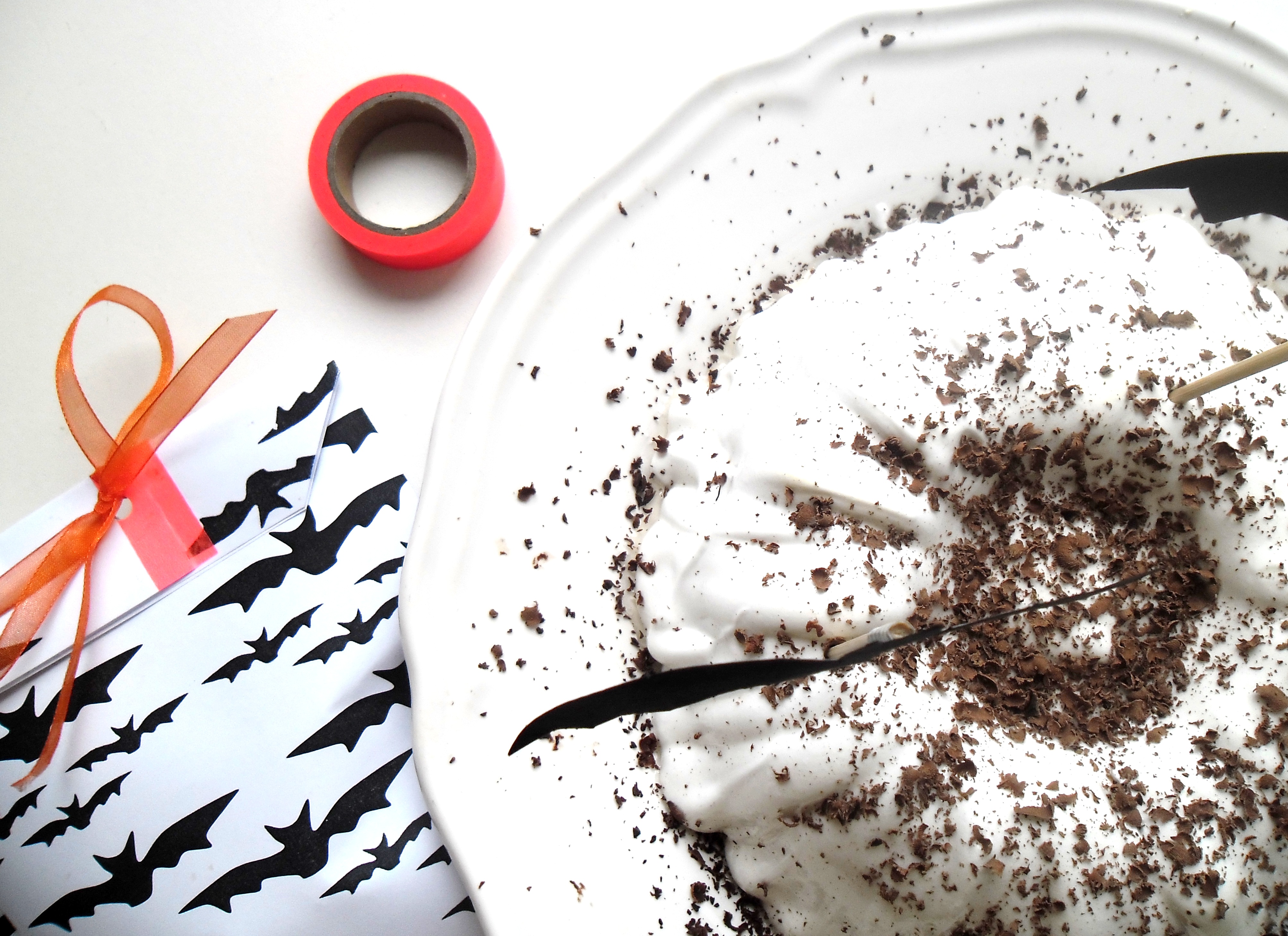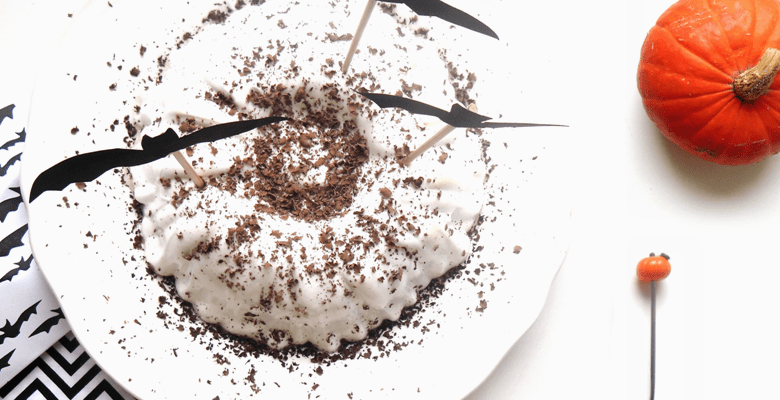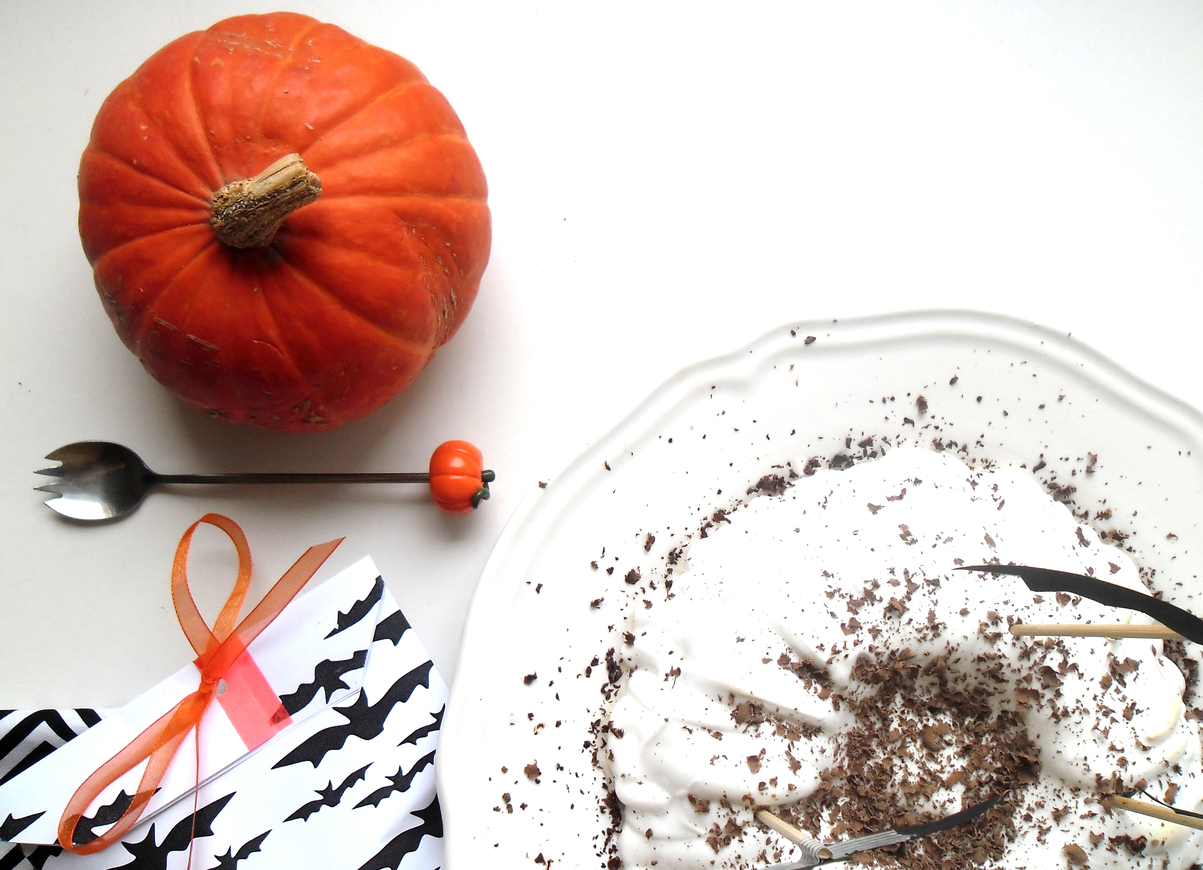 On commence l’Halloween Party par un gâteau au potimarron, moelleux et gouteux, recouvert d’un manteau de meringue blanche sucrée à souhait et d’une pluie de chocolat noir râpé … le tout décoré d’une envolée de chauve-souris …