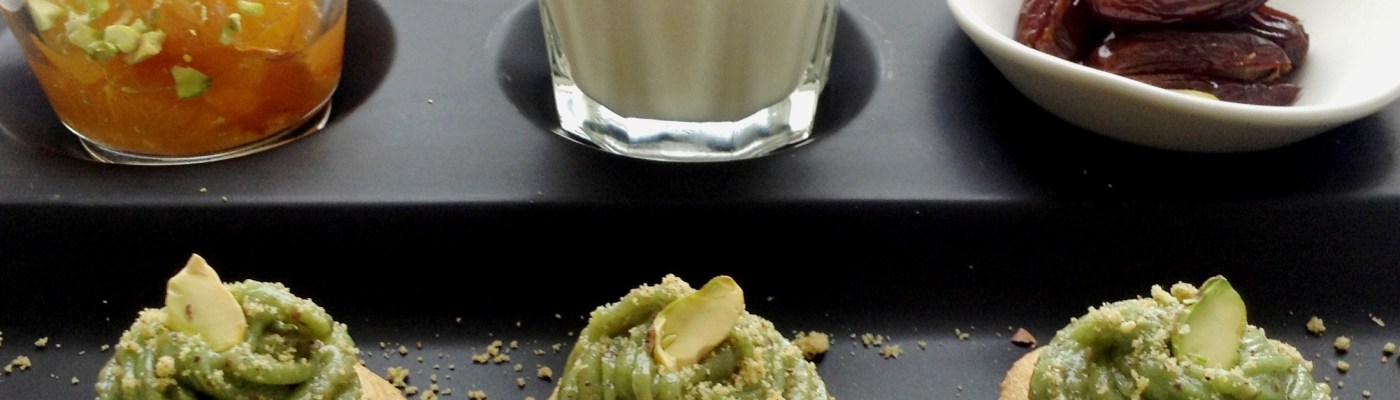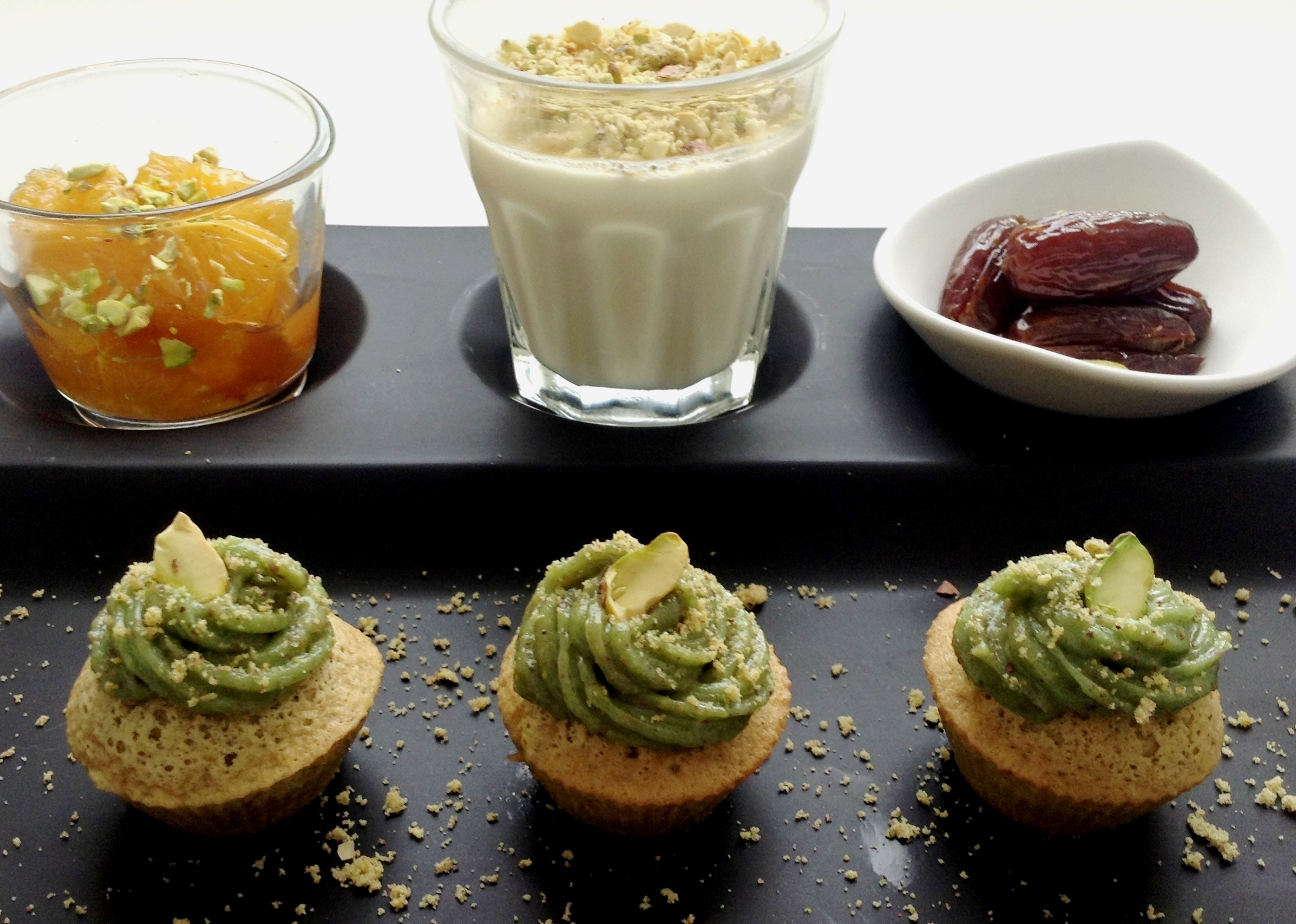 Vendredi dernier, soirée « girls only » avec les copines, en mode « Oriental Party ». Au programme, comme on sait si bien le faire, papotage, bonne humeur, rigolage et festin de reine aux mille et une saveurs . Houmous et boulettes de kefta [ bravo Smita ! ], couscous royal super méga [ merci Cécile pour tes bons petits plats ], sans oublier le vin [  bien wèj Amanda ! sans toi on se serait partager une bouteille de Porto déjà vide et un coca … ], le pain [ le vrai, fait comme là-bas, chez mon Maroc à moi ] et le thé à le menthe, préparé avec amour par Myriam [ ma sœurette ] avec THE menthe fraîche, servi dans THE théière et versé avec THE geste de professionnel … Et le dessert alors ?! Eh ben c’était ma mission à moi ! Pour coller au thème de la soirée, j’ai choisi la pistache comme ingrédient commun à toutes mes mignardises sucrées. Miam miam la salade fraîche d’oranges au miel, avec éclats de pistaches et cannelle, la panna cotta à la fleur d’oranger avec … poudre et éclats de pistaches sucrés, les minis cupcakes à la pistache [ original ! ] avec crème de … [ suspense ] … pistache [ ! ], et pour finir ce dessert oriental, des dattes [ pour changer un peu des pistaches … ]. On a bu un peu, on a papoté beaucoup, on a mangé à la folie, on a rigolé passionnément et on s’est ennuyée pas du tout ! Et next time, c’est chez wam … pour un tout autre thème … toutes autres saveurs … mais tout autant de bonne humeur et de miam miam !