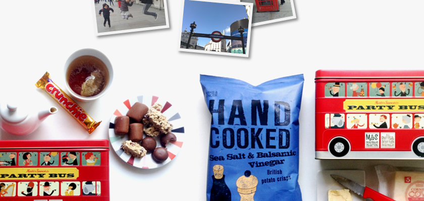 Pour ce shopping alimentaire de dernière minute, en attendant de monter à bord du train amphibien, j’ai shoppé chez Marks & Spencer une poignée de Crunchie bars [ mon péché mignon ], un assortiment de mini bites : chocolate sponge rolls [ roulés au chocolat, fourrés de crème au chocolat et enrobés de … chocolat … rien que ça ! ], oatberry clusters [ bouchées à l’avoine et aux airelles, recouvertes d’une couche de yaourt ], teacakes [ biscuits au chocolat fourrés à la guimauve ], mais aussi un joli double-decker bus rempli de shortbread en tous genres, sans oublier le vrai thé anglais, un paquet de salt & vinegar crisps king-size, du cheddar à gogo et pour finir des Ginger Snaps [ biscuits au gingembre ], des Digestives au chocolat au lait et des crunchy cookies en veux-tu en voilà … de quoi me rappeler le doux goût de mon Angleterre chérie pendant un certain temps !