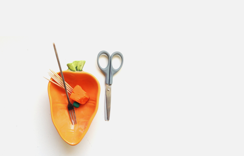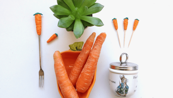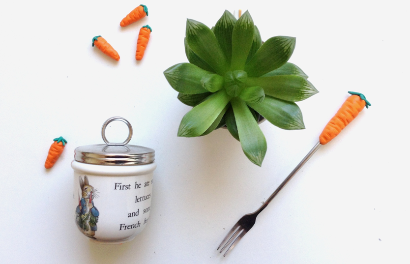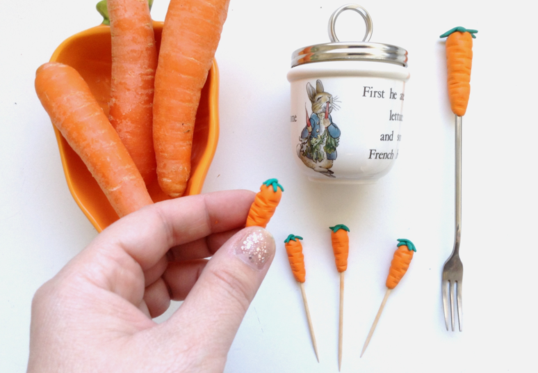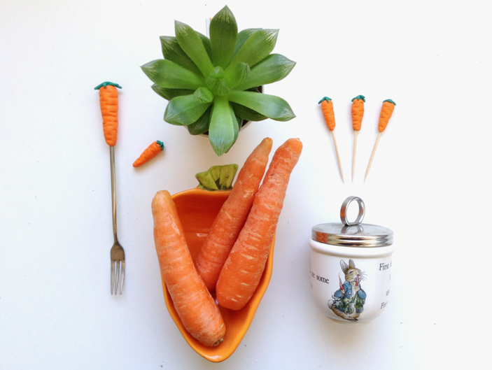 … Un peu de fimo, des cure-dents, des ciseaux, une mini fourchette et voilà des accessoires super chouettes pour le carrot cake de Pâques … et même si la carotte n’est pas considérée comme un fruit, étant ingrédient star de mon gâteau préféré, elle fera quand même partie de ma collection Tutti Frutti !