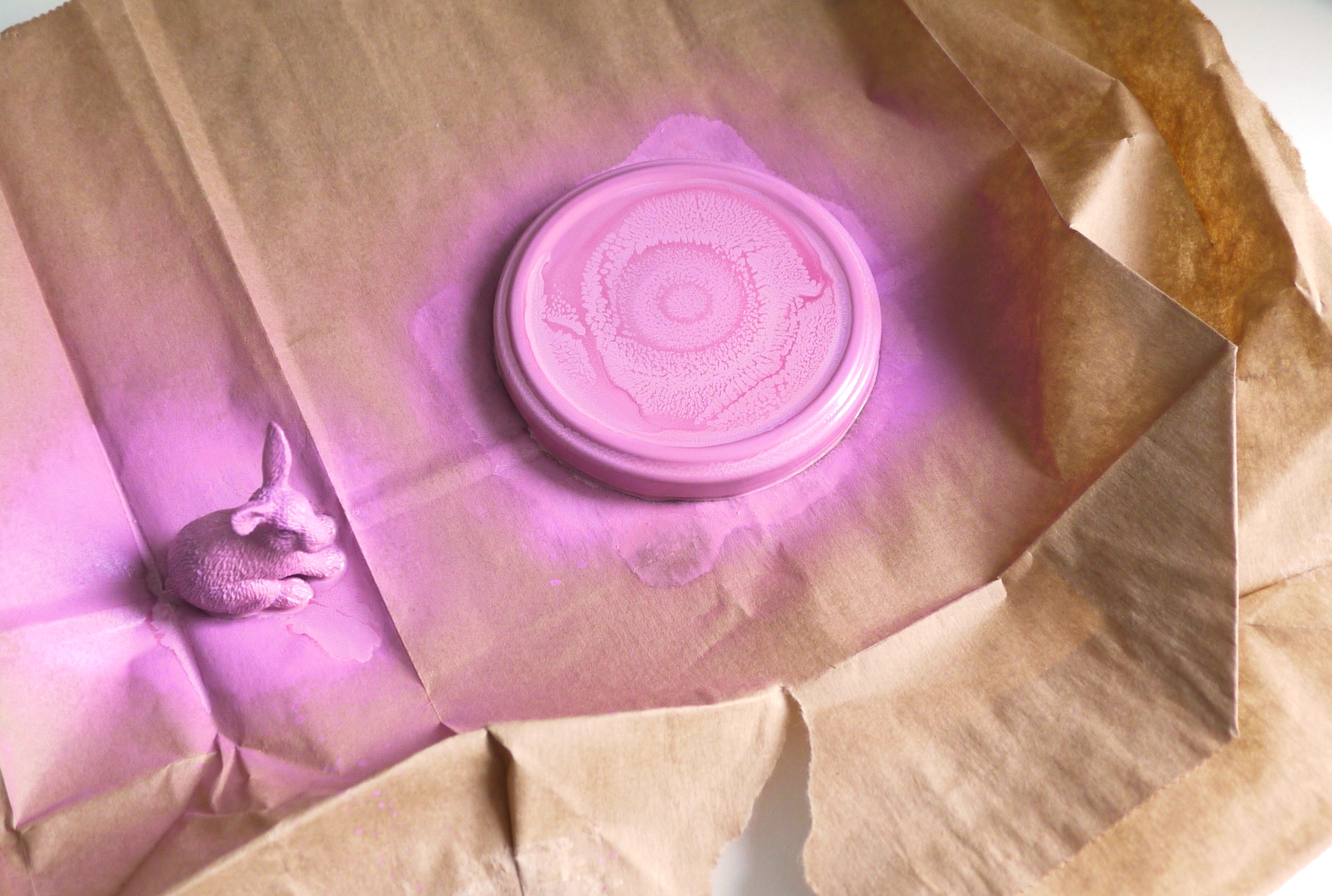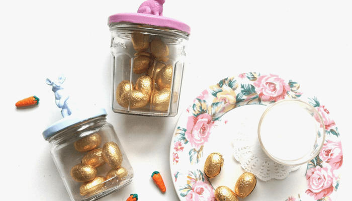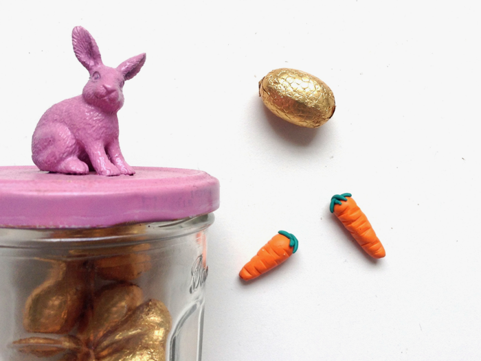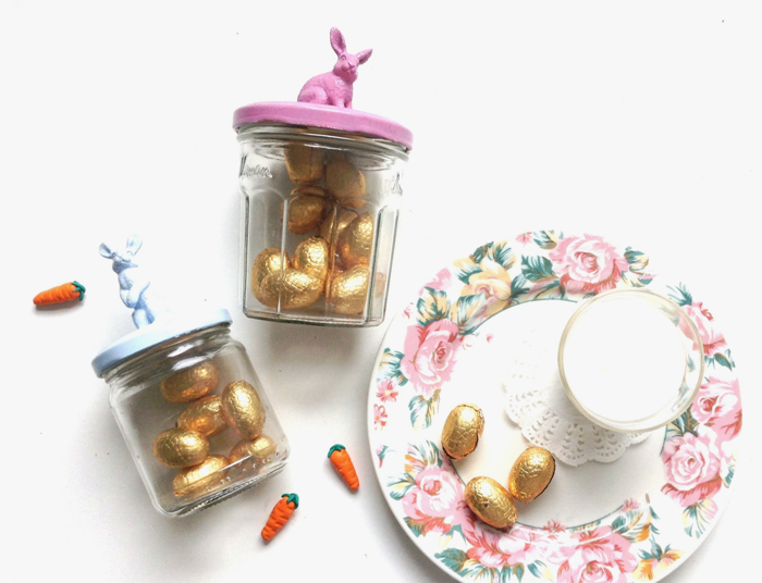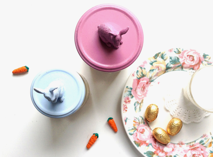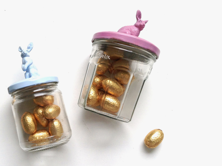 … des petits lapins, des bocaux, des bombes de peinture et de la colle forte, pour un petit DIY spécial Pâques …