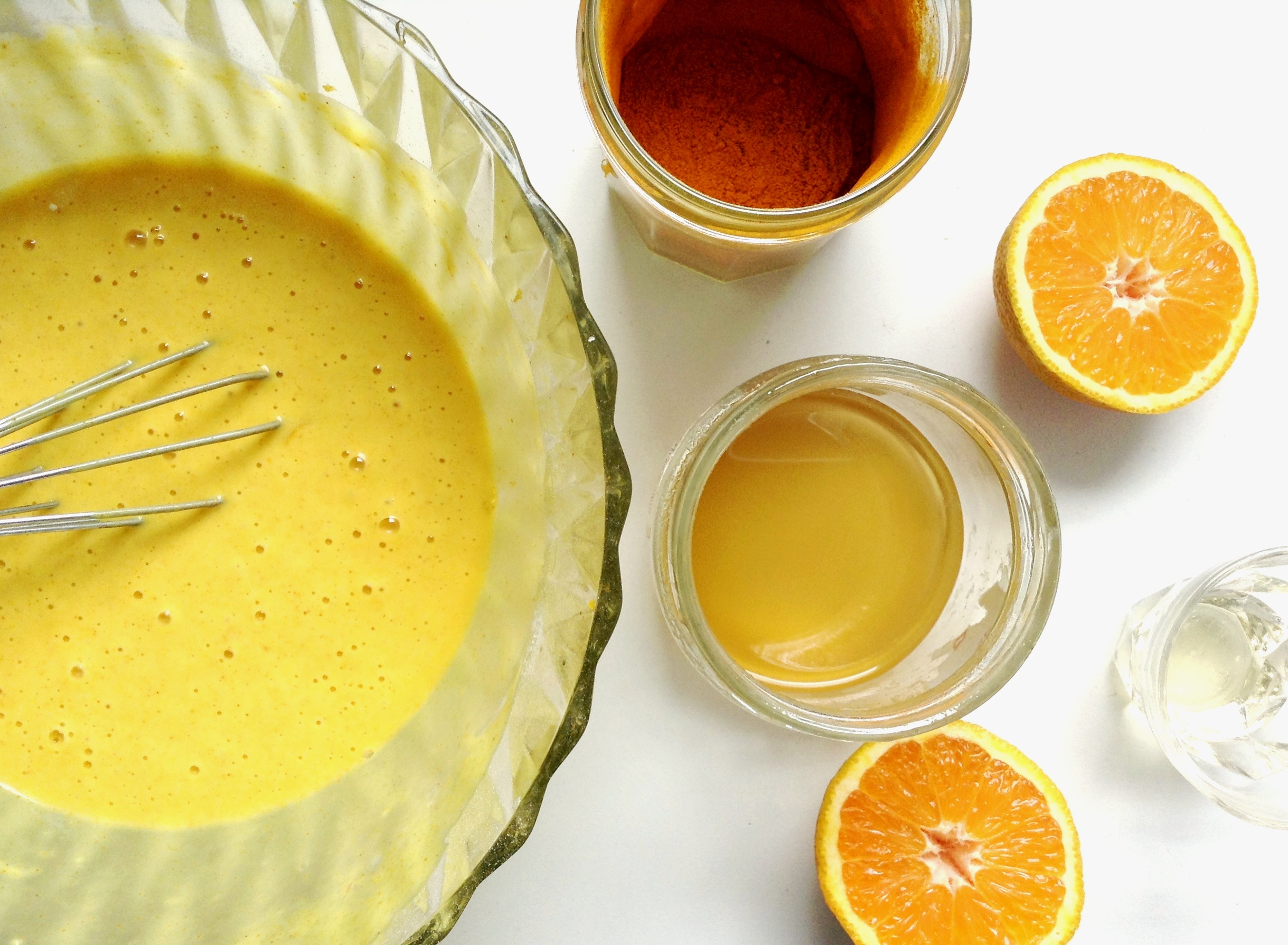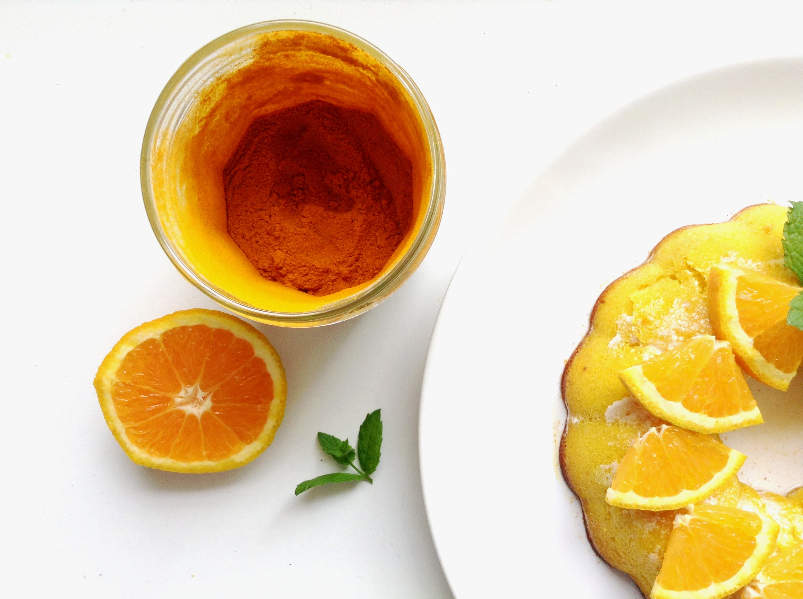 Une base de gâteau au yaourt quelque peu revisitée : 1 yaourt nature, 3 oeufs, 1 demi pot d’huile, 1 pot de sucre, 1 pot de miel, 3 pots de farine, 1 paquet de levure, le zest et le jus d’une orange, 2 cuillères à soupe de fleur d’oranger, 1 cuillère à soupe de safran … et 30 minutes à 180° plus tard le gâteau est prêt !