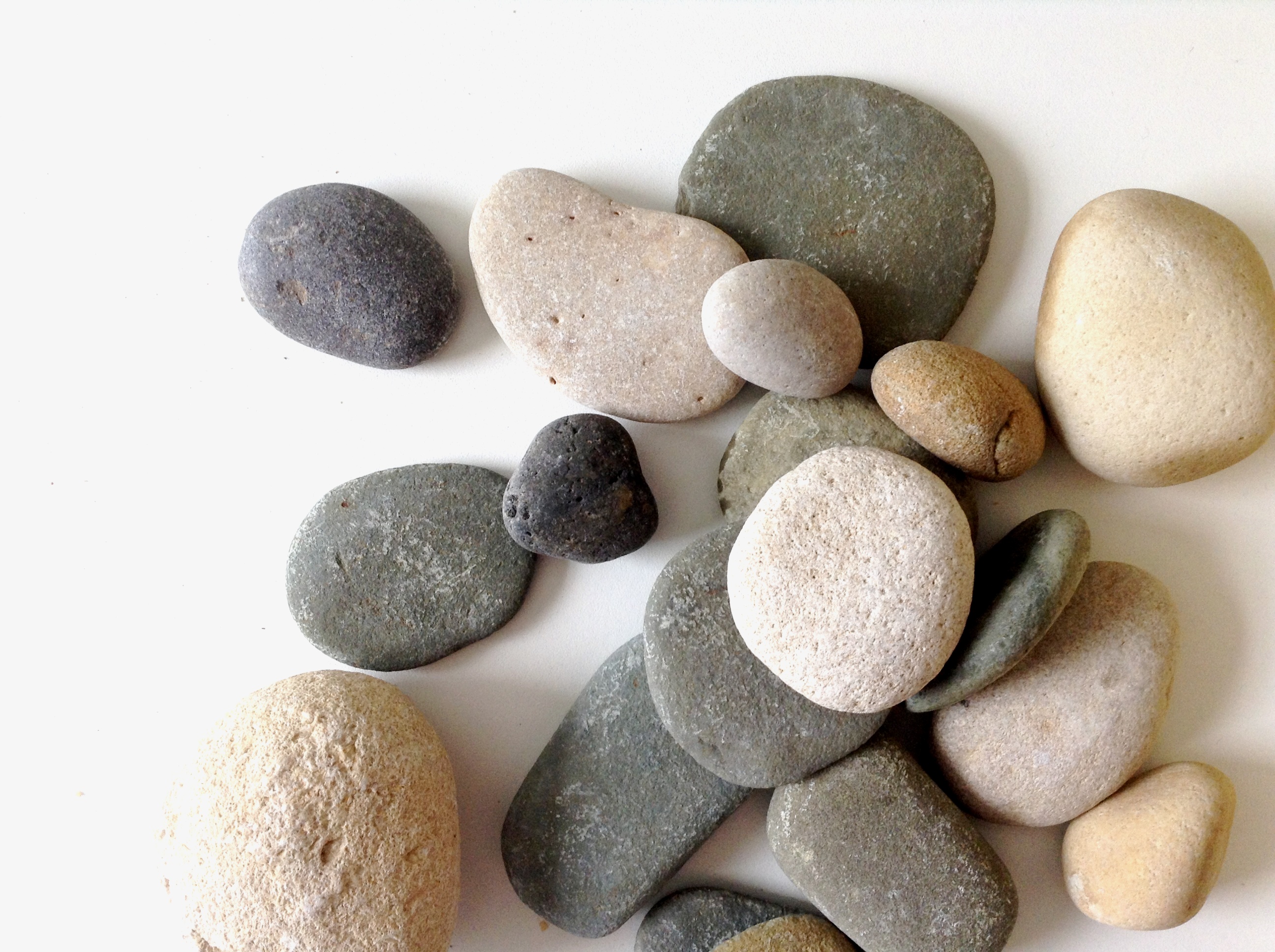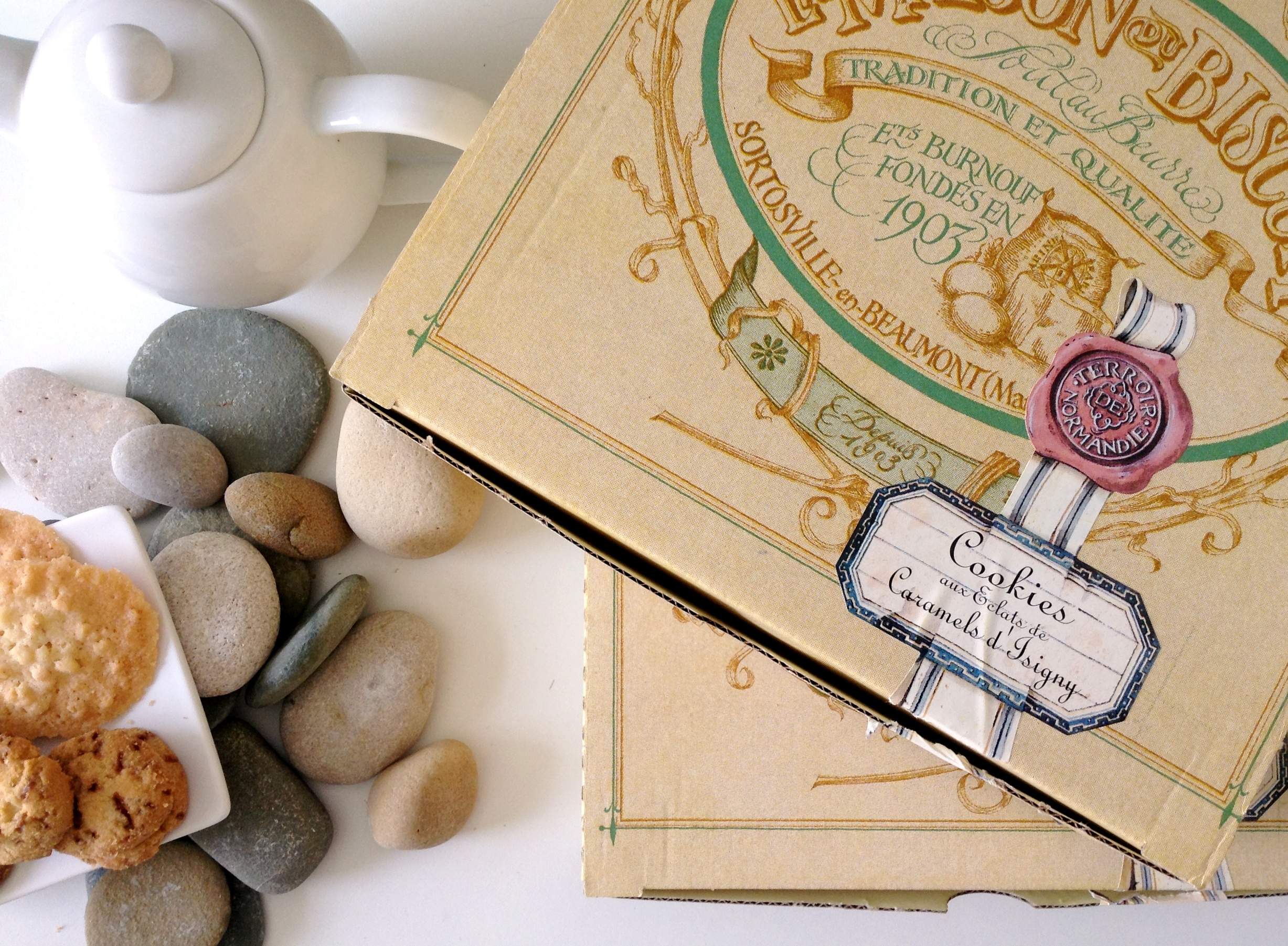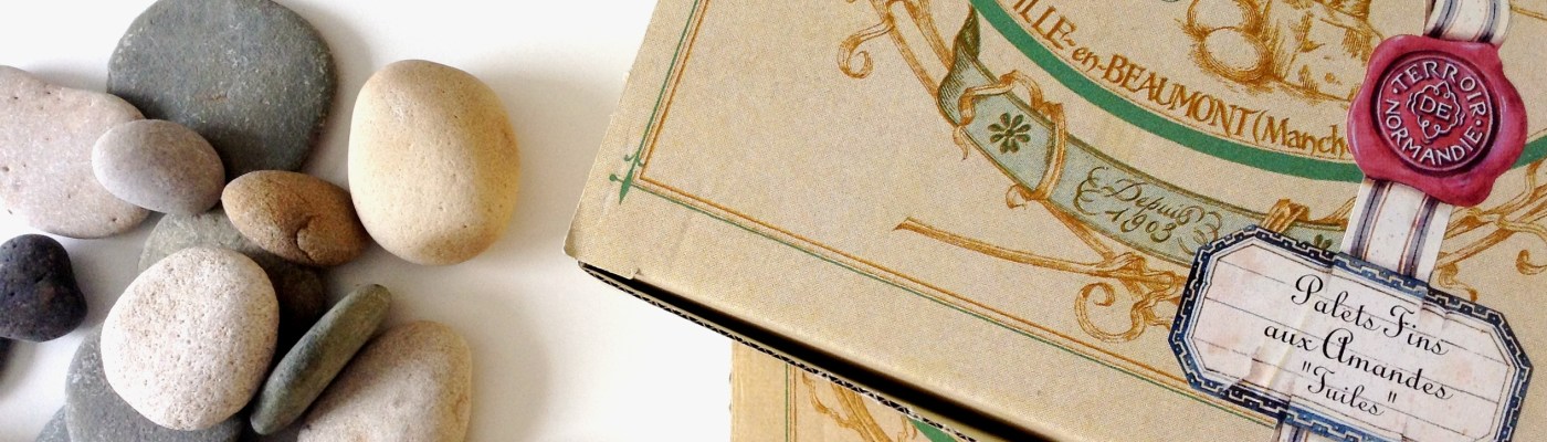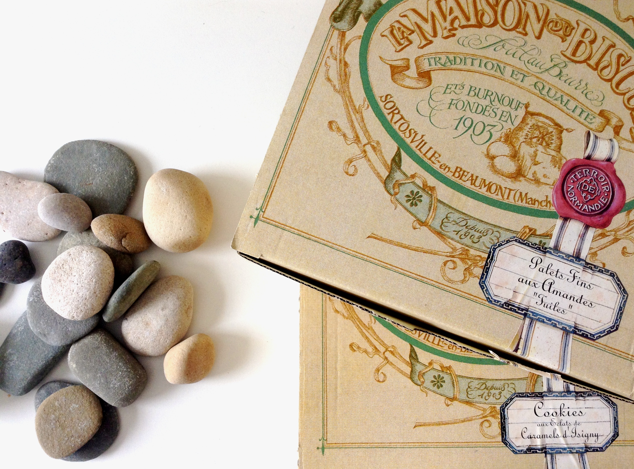 Un petit tas de jolis galets ramassés sur les belles plages de Normandie et deux grosses boîtes de sablés achetées à La Maison du Biscuit : palets fins aux amandes et cookies aux caramels d’Isigny. Yummy Yummy !