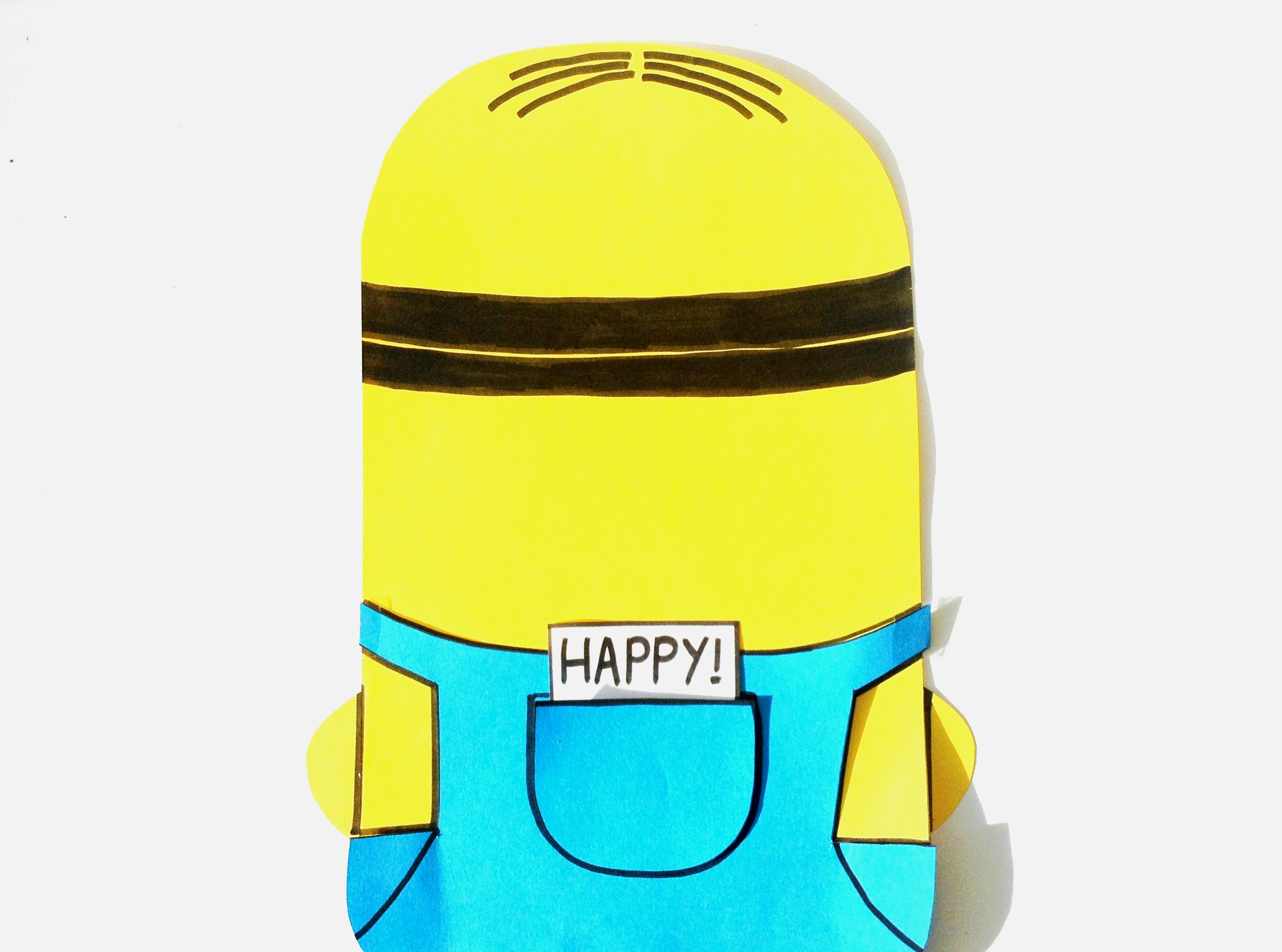 Il suffit de quelques fournitures du genre crayons, marqueur, scotch, colle, perforatrice, ciseaux, ficelle, rubans … d’un morceau de carton pour fabriquer une petite boite rectangulaire sans fond et sans plafond, puis d’une feuille de papier fin et coloré pour tapisser le fond, qui fera office de caleçon … et enfin, de feuilles de papier canson aux couleurs des Minions !