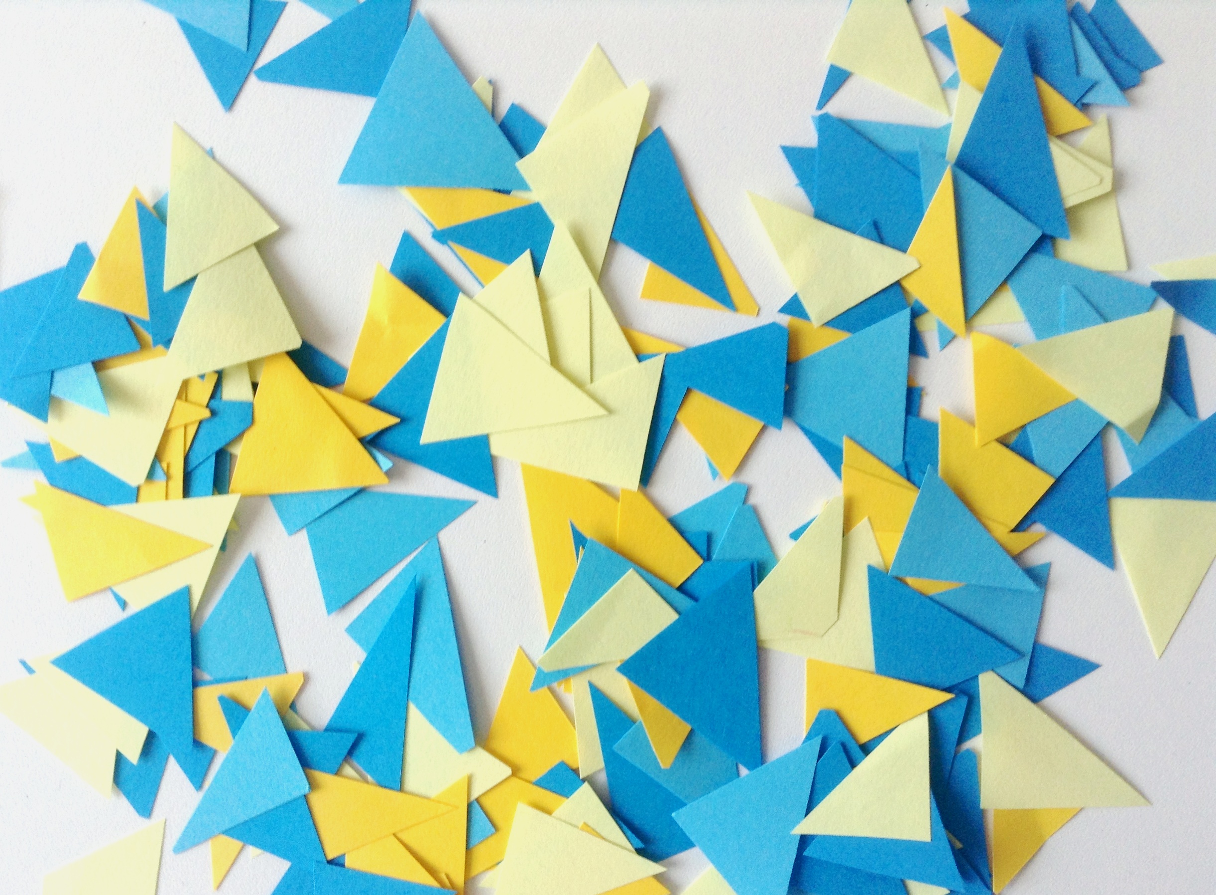 Une fois la boîte assemblée, tapissée de jaune sur les côtés et perforée en haut, afin d’y passer de la ficelle pour pouvoir la suspendre au plafond, puis le fond en papier scotché de l’intérieur et délicatement traversé de 3 rangées de rubans dans le sens de la longueur, il est l’heure de s’occuper de notre Minion ! A partir de là, c’est mission découpage, dessinage, coloriage, assemblage, scotchage et collage … sans oublier le remplissage : confettis triangles avec les chutes de papier, mini smarties, mini kits maison pour fabriquer ses propres mini Minions, mini flacons à bubulles et mini porte-clefs bonbons également maison …