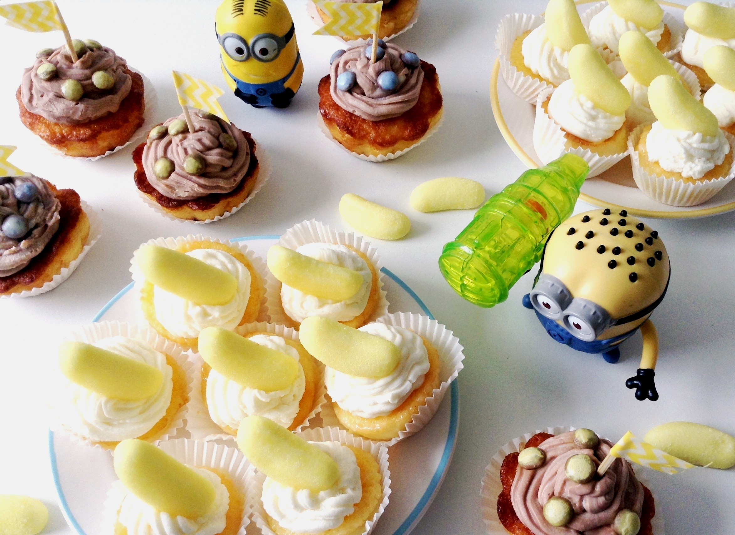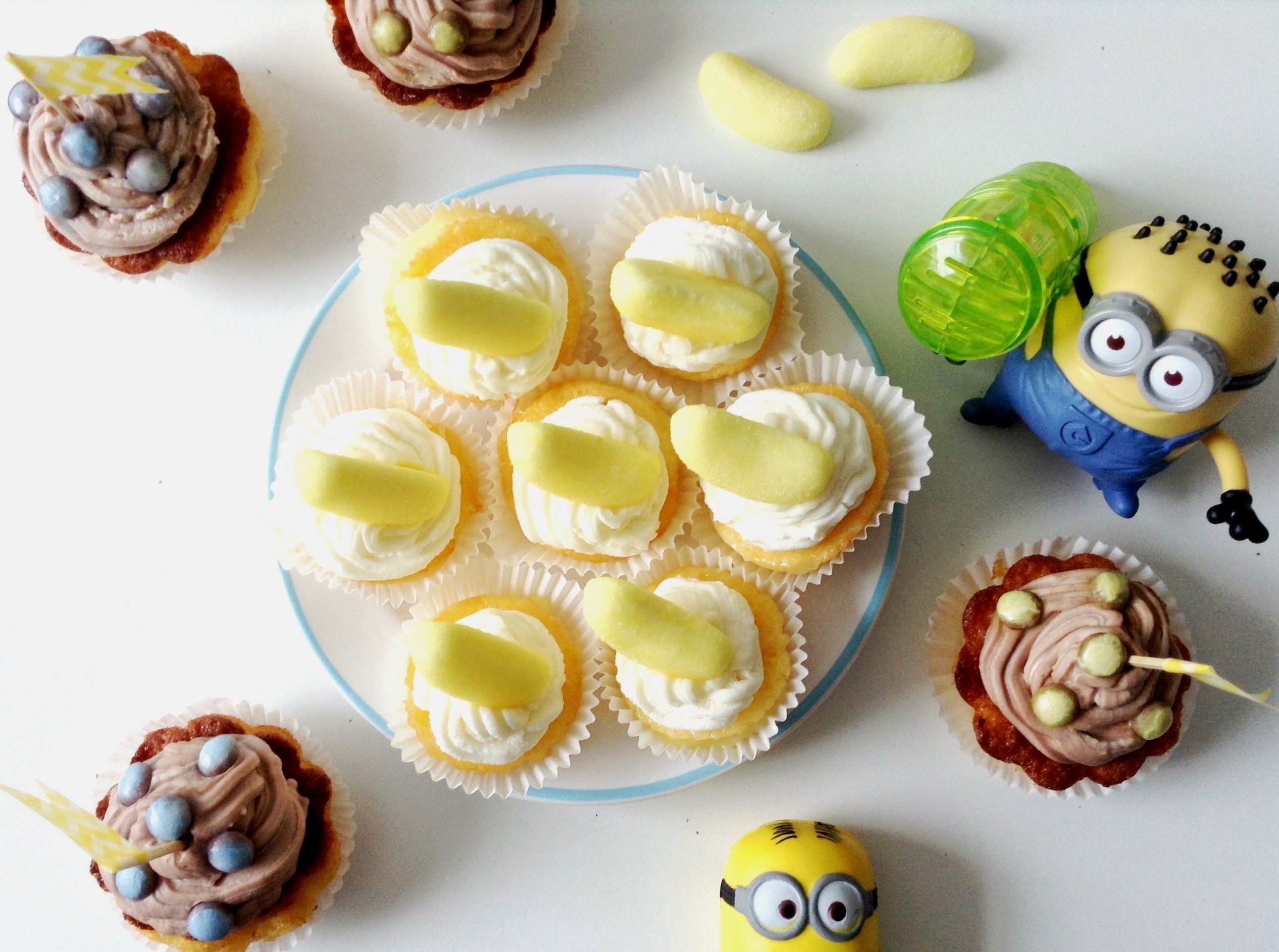 Les Minions, les vrais [ oui … je suis sure qu’ils existent ! ] sont fous [ … complètement toc toc … ] de pappel / babel [ pommes selon le dialecte ] et surtout de bananaaaah [ bananes ], d’où des cupcakes et un gâteau, à base de génoise au citron, de gelée-guimauve faite-maison avec les mythiques bananes bonbons et d’un nappage mascarpone agrémenté de bananes bonbons, pour régaler le bidon de mon Minion et des Minions de mon Minion !
