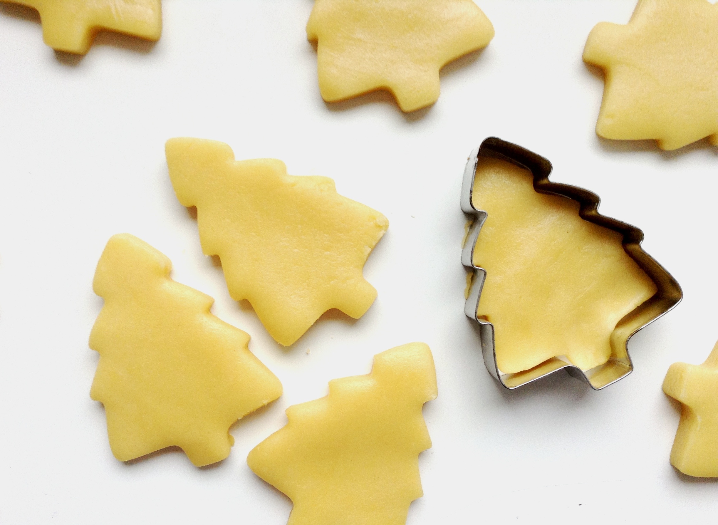 Dans un grand bol, il suffit de mélanger le beurre et le sucre avec un batteur électrique ou ses petites mains [ j’aime mettre la main à la pâte ! ], puis l’oeuf, et la farine. Une fois les ingrédients bien mélangés et la boule de pâte homogène formée … hop … un pti tour au frigo pendant une quinzaine de minutes pour la laisser se reposer au frais. Le four préchauffé à 175°C, la pâte bien reposée, il est à présent temps de l’étaler et de découper les biscuits avec un emporte pièce, comme un beau sapin, roi des forêts, puis de les enfourner pendant 8 minutes sur une plaque de silicone ou de papier sulfurisé.