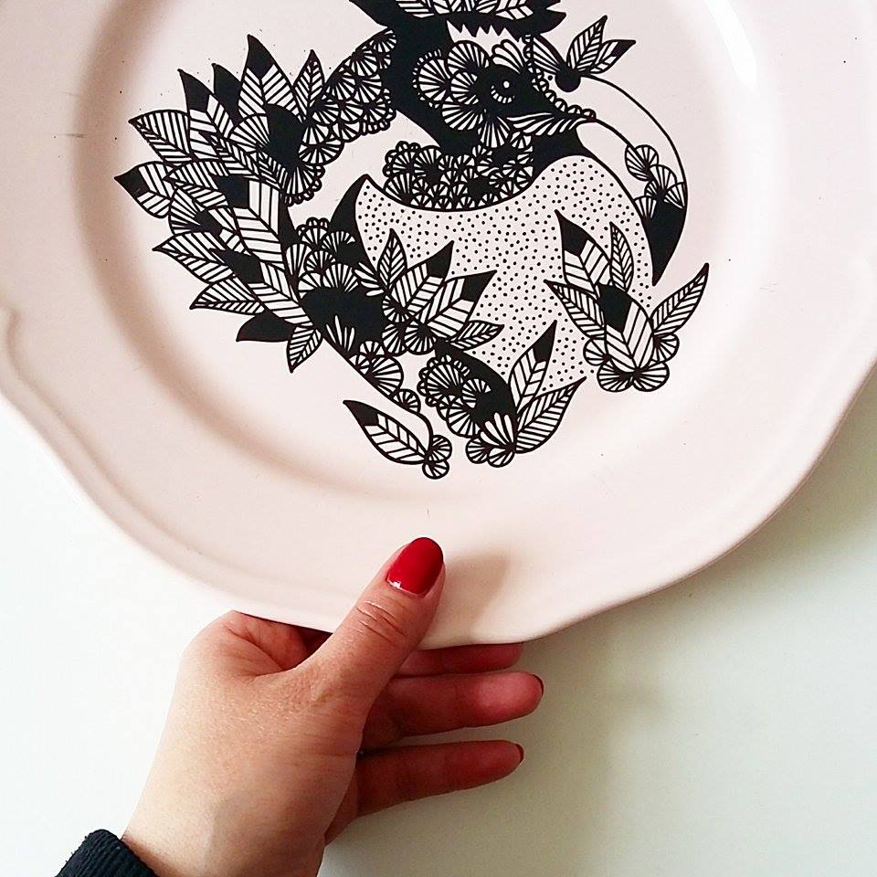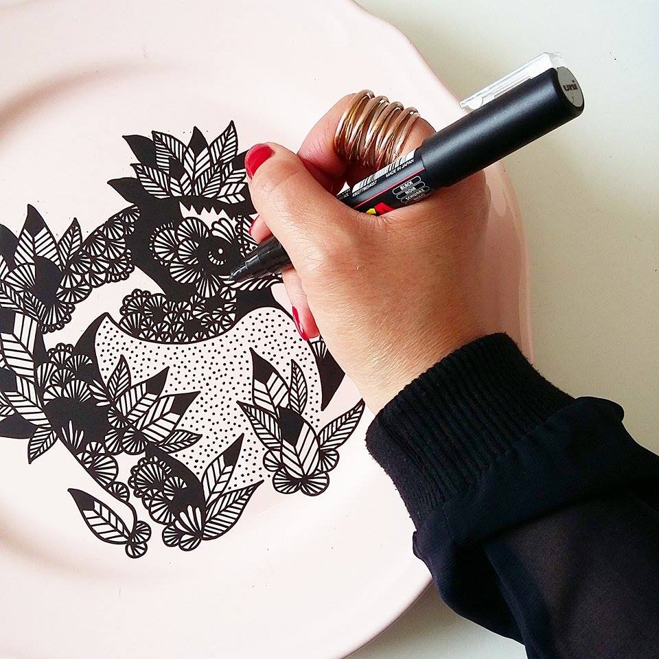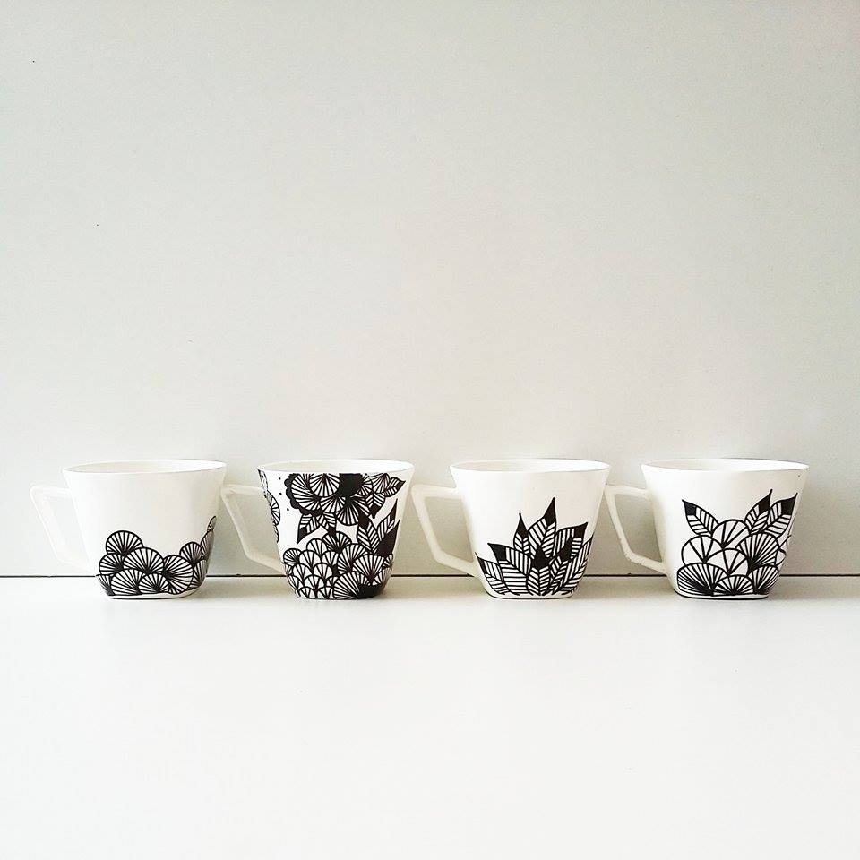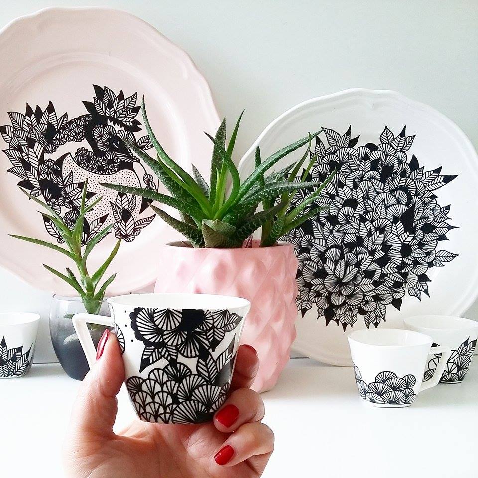 Allez, hop ! Posca en main, petits dessins dans mon style bien à moi et quelques heures plus tard voilà quatre petites tasses à café [ même si je n’en bois pas car je suis une madame thé ] et un début de collection d’assiettes personnalisées ! Du noir et blanc bien évidemment, des feuilles, du graphique, un flamant et un design unique. Un petit tour au four pour fixer l’encre-peinture [ 30 mns à 220°C pour la porcelaine et 160°C pour la céramique ] … et déjà une foule d’idées qui s’entremêlent dans ma cervelle pour des créations futures.