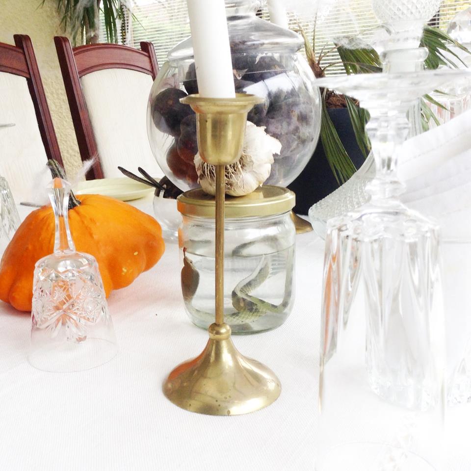 Ce soir on dîne au « manoir » de maman, en famille, parents et enfants, au milieu de toiles et d’araignées, de vaisselle vintage et de cristal, de fonds de whisky vieux de cent ans, de courges et de citrouilles, de bocaux d’insectes et de serpents, de gousses d’ail pour éloigner les invités pas vraiment désirés …