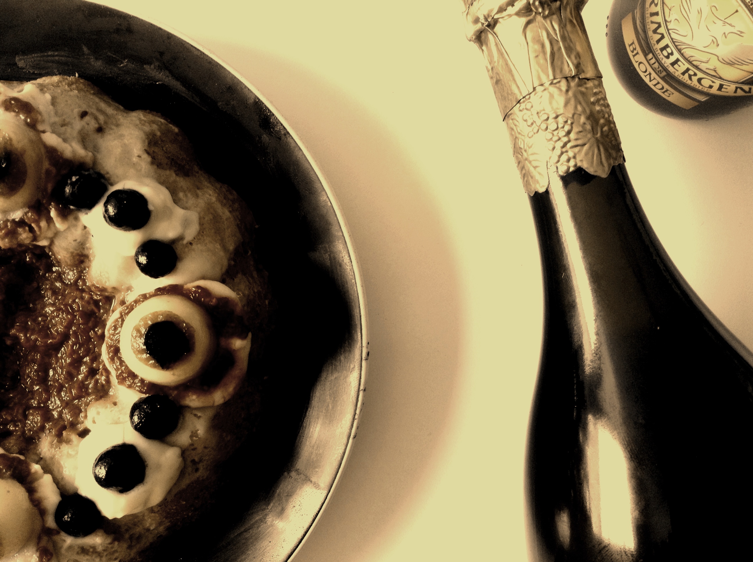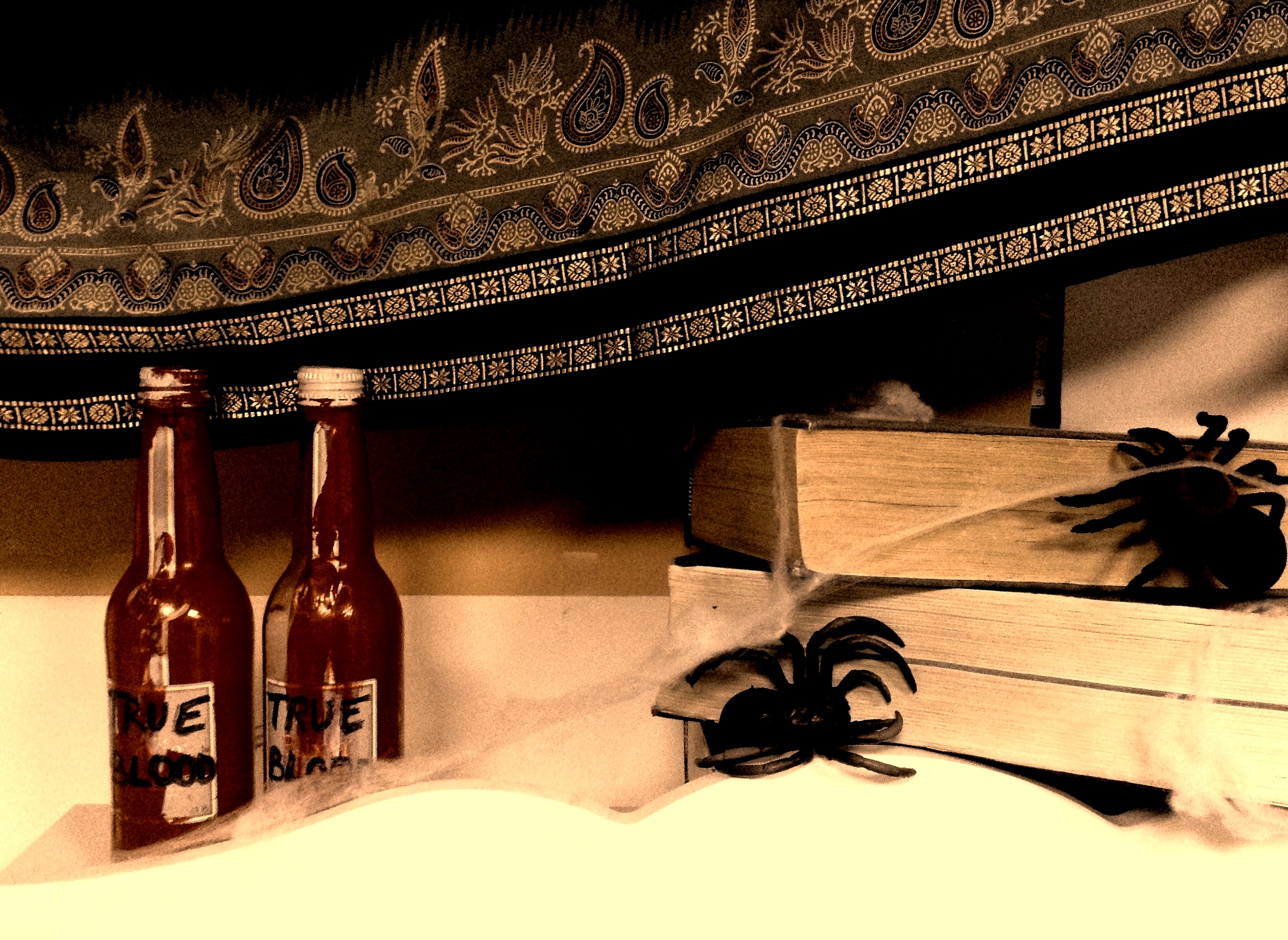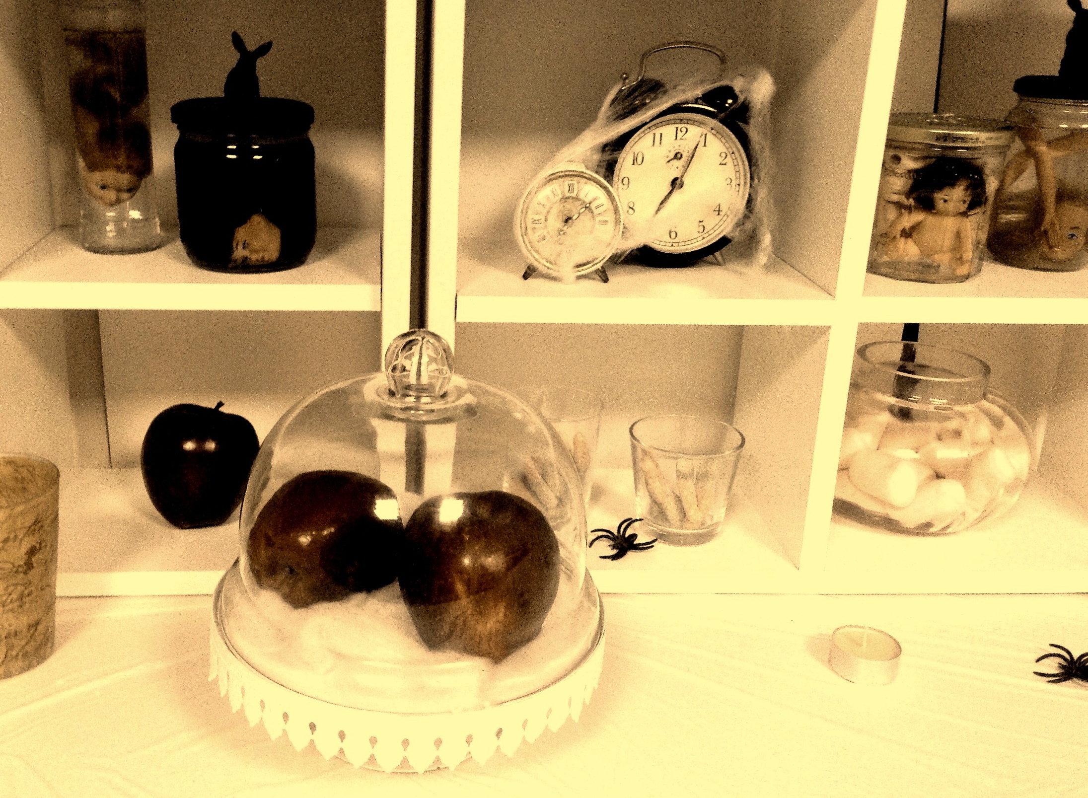 … Le protocole étant à présent respecté, allons festoyer dans le cabinet de curiosité où se mêlent breuvages, recettes de grand-mères sorcières, et mets délicats à déguster … Bloody Mary, le must au bal des Vampires, confitures de poupées maison au formol, idéal contre le cholestérol, cocktail arachnide également maison, bourré de protéines, et d’autres nombreux plats très fins qui se mangent sans faim … sans oublier que my carrot cake aux yeux d’amande et à la purée de cervelle de framboises is watching you !!!