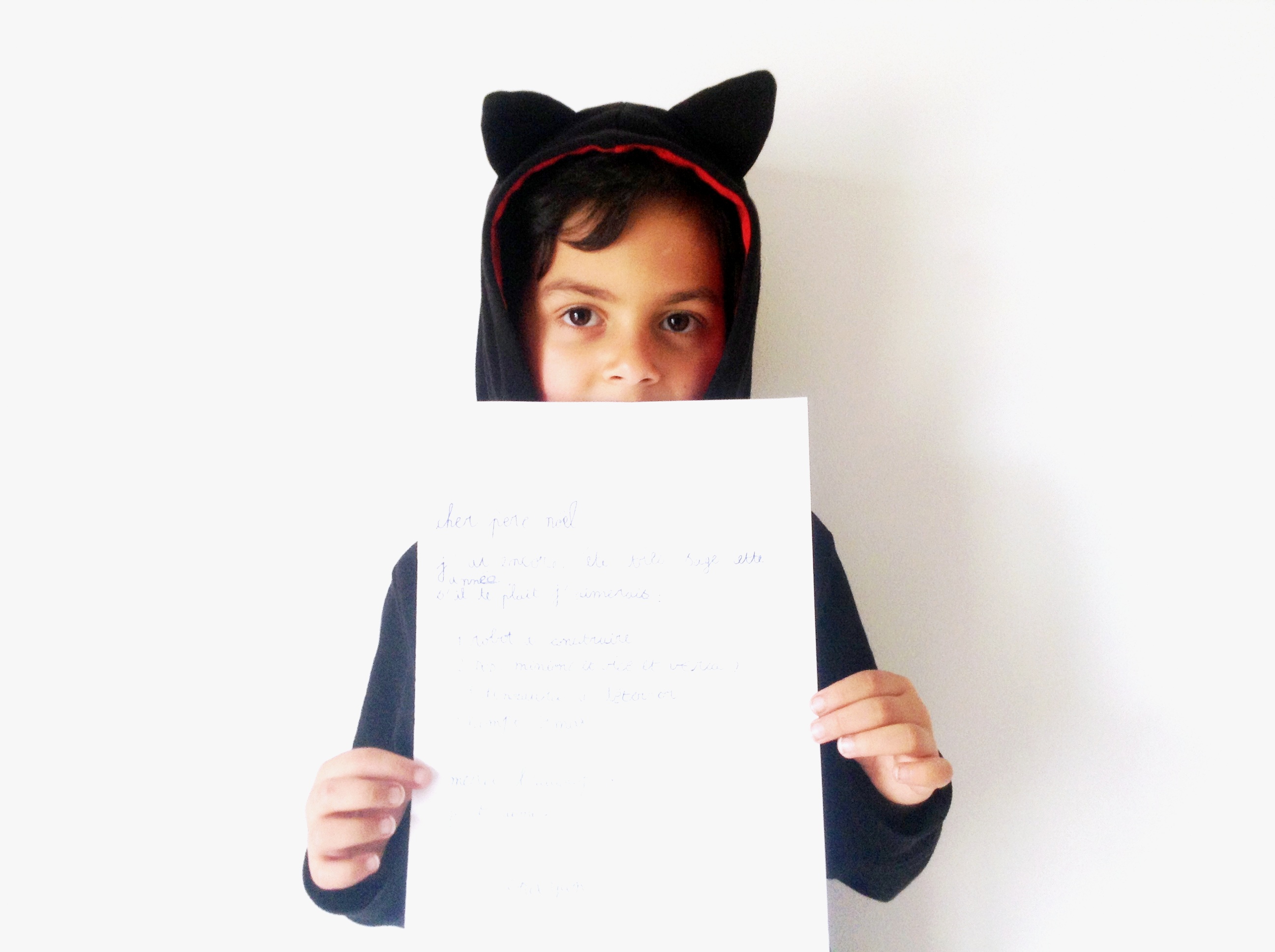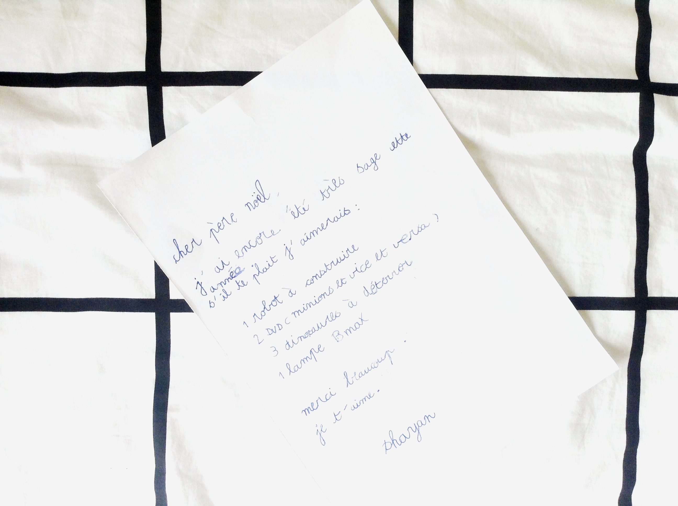 Me régaler à voir mon pti Sha si appliqué à écrire sa lettre au Père Noël [ même si tout est déjà dans la hotte, chaque demande ayant été scrupuleusement étudiée et respectée à la lettre … avec quelques cadeaux bonus en plus parce qu’il le vaut tellement bien. Il est si sage et si gentil toute l’année qu’il mérite largement et plus encore, tout ce que je peux lui donner ].