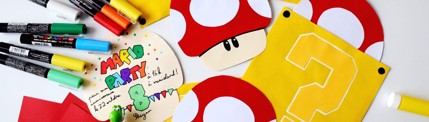 Comme à chaque fois, on commence par les invitations, toujours munie d’un lot de feuilles colorées, d’une paire de ciseaux, de bâton de colle, de feutres Posca, je me suis éclatée … et voilà, petits « Toad » champignons, cachés dans les fameux « Points d’Interrogation » ont fait leur effet auprès des invités.
