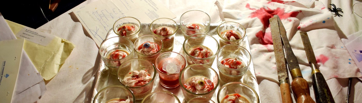 Dégustées côté labo [ pour les psychos ] ou côté salle à manger [ lounge VIP ], ces crèmes sont en réalité des perles du Japon au lait d’amande, aromatisées à la fleur d’oranger, montées de mascarpone avec coulis de fruits rouges, et « the cherry on the cake », ou devrais-je dire « the eyeball on the pudding », un bel oeil en pâte d’amande façonnée par mes petites mains innocentes et bienveillantes … le tout accompagné de banana bread et raisin.