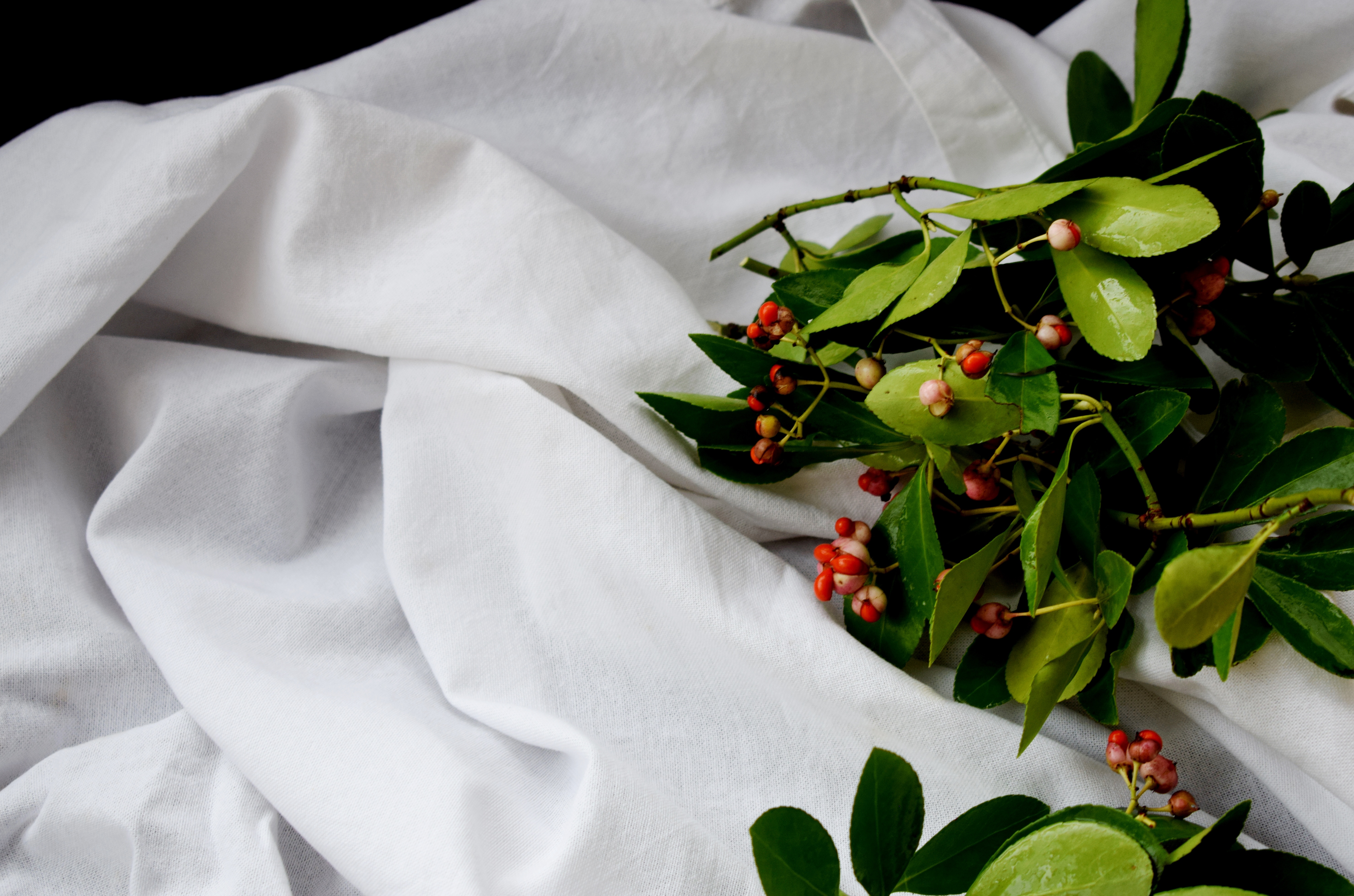 Je suis alors redescendue dans mon jardin [ comme pour la vraie couronne de Noël ] pour y couper des petits brins [ … de ce grand arbuste dont je ne connais pas le nom, parce qu’à boules rouges, et parce que je n’ai pas de romarin (cf la chanson) ni de houx ].