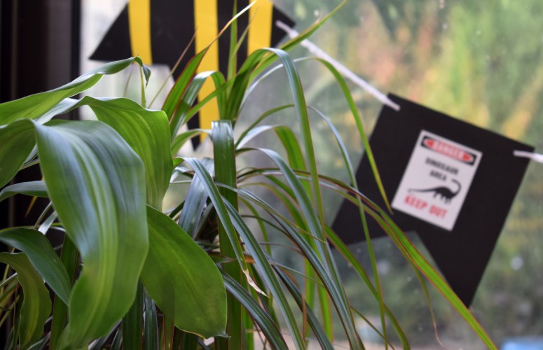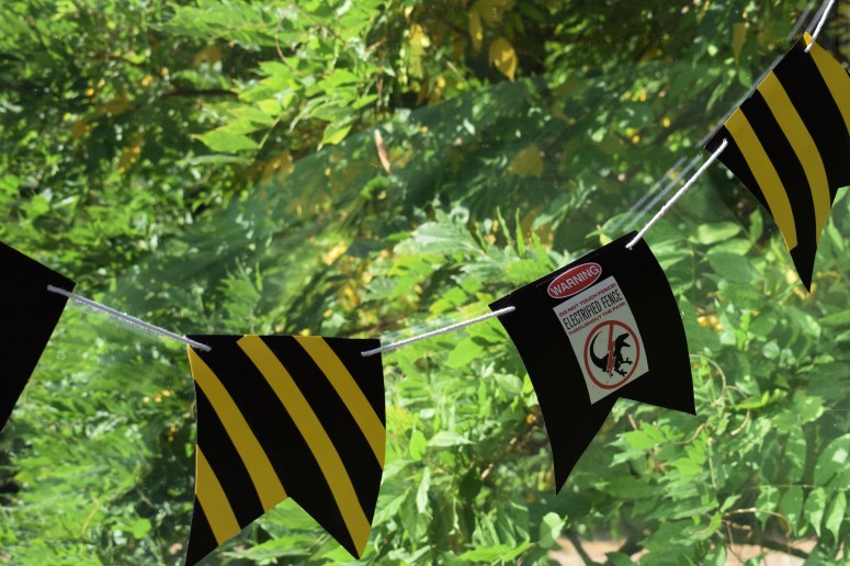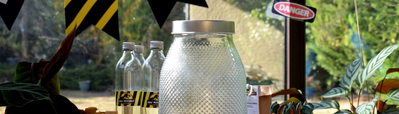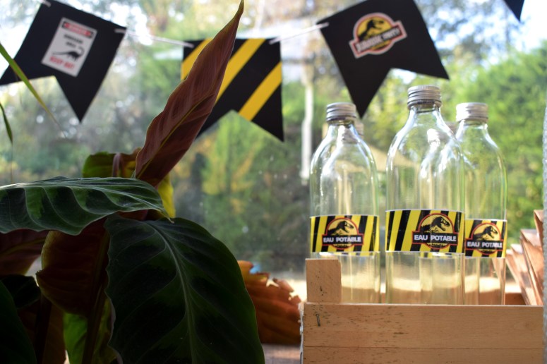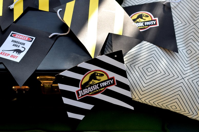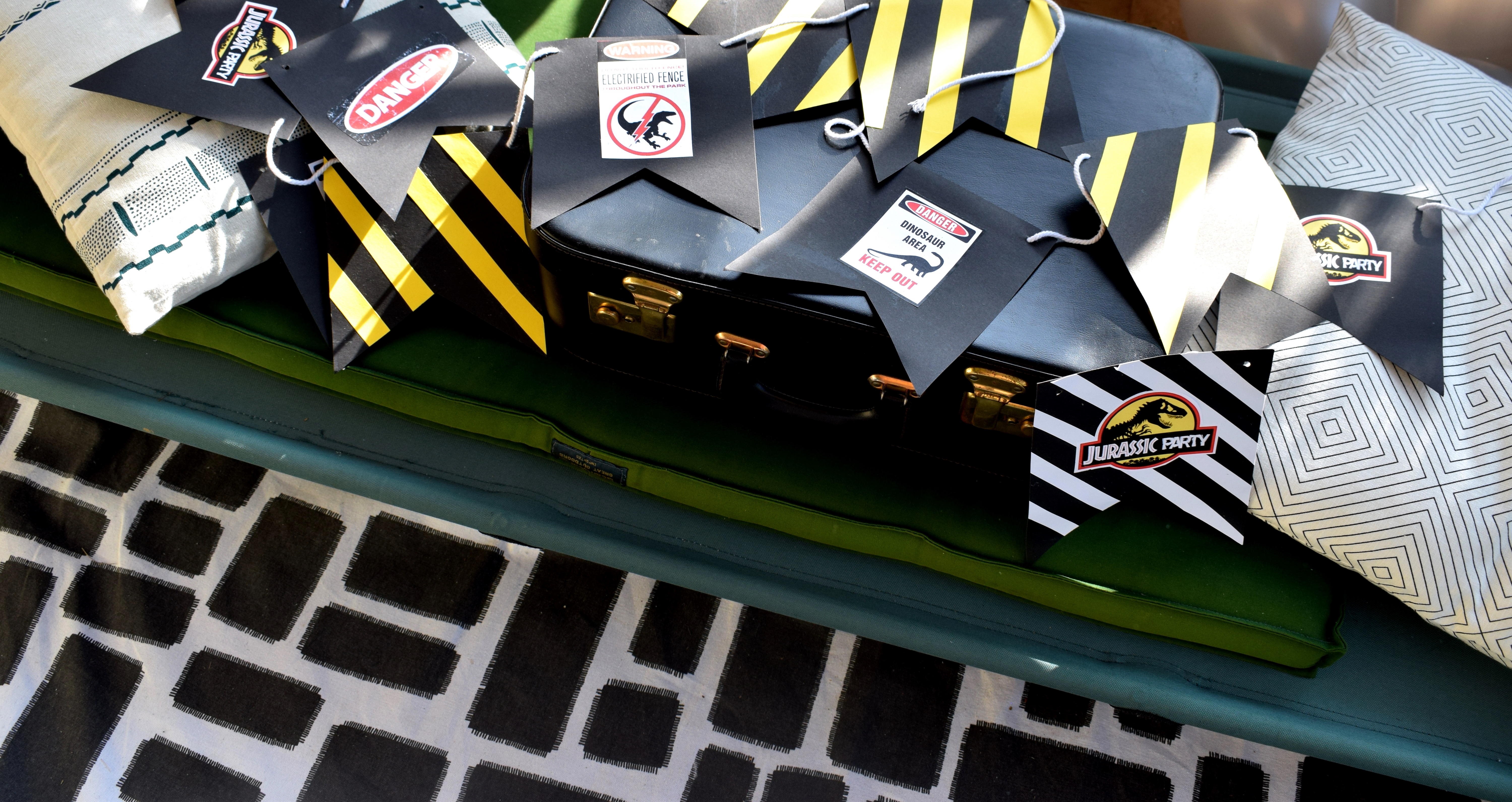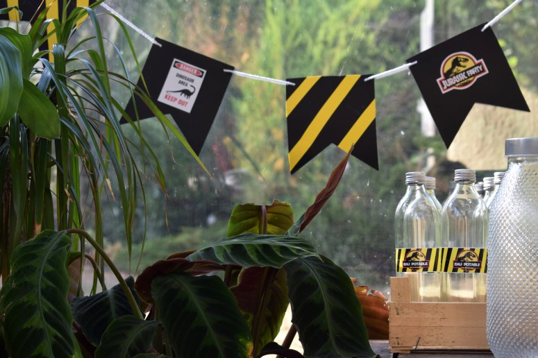Logo de Jurassic Park remasterisé en Jurassic Party, quelques visuels trouvés sur le net, des guirlandes de drapeaux noirs en papier type canson customisées … le tout accroché / scotché ici et là dans le campement de la team d’explorateurs avertie.
