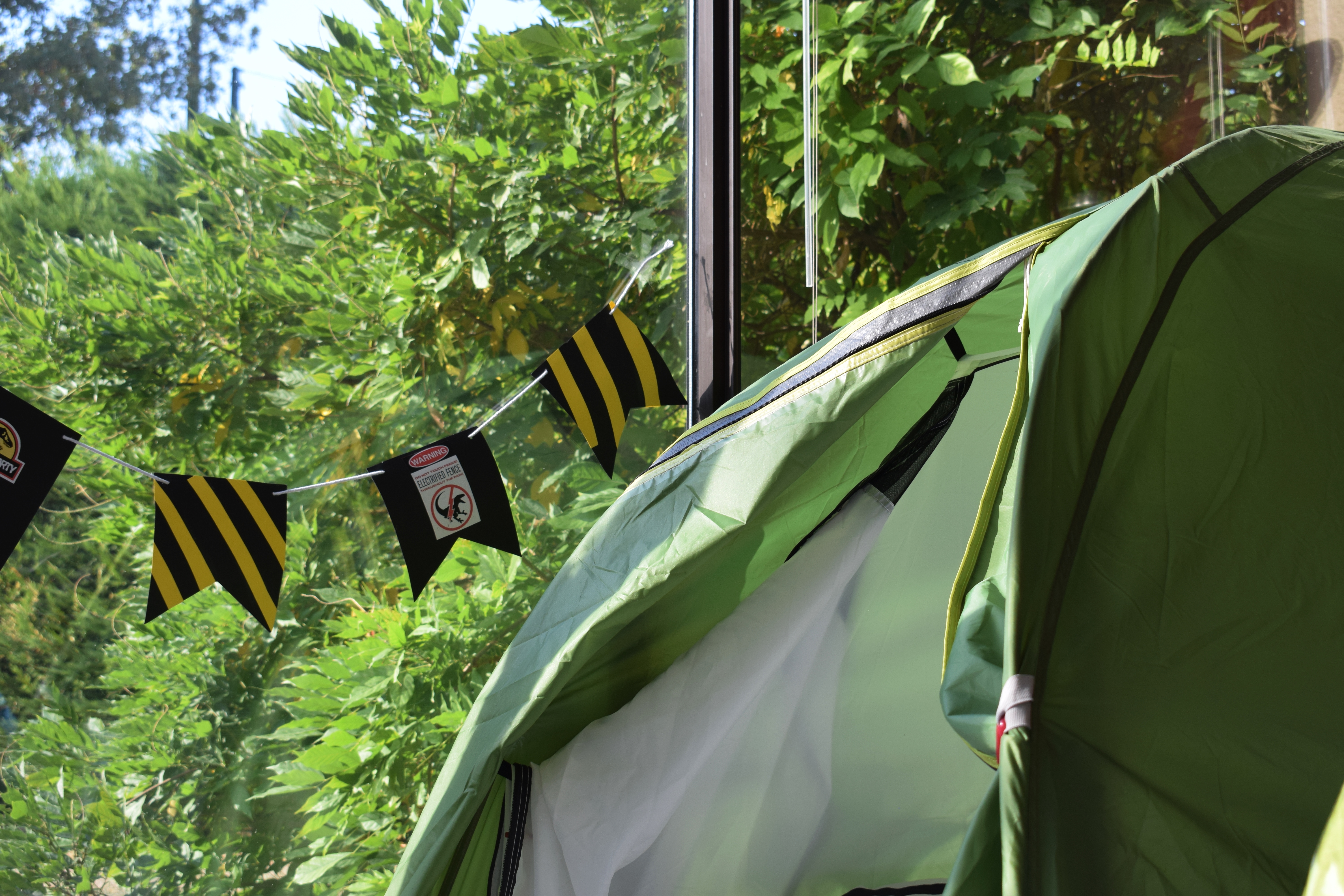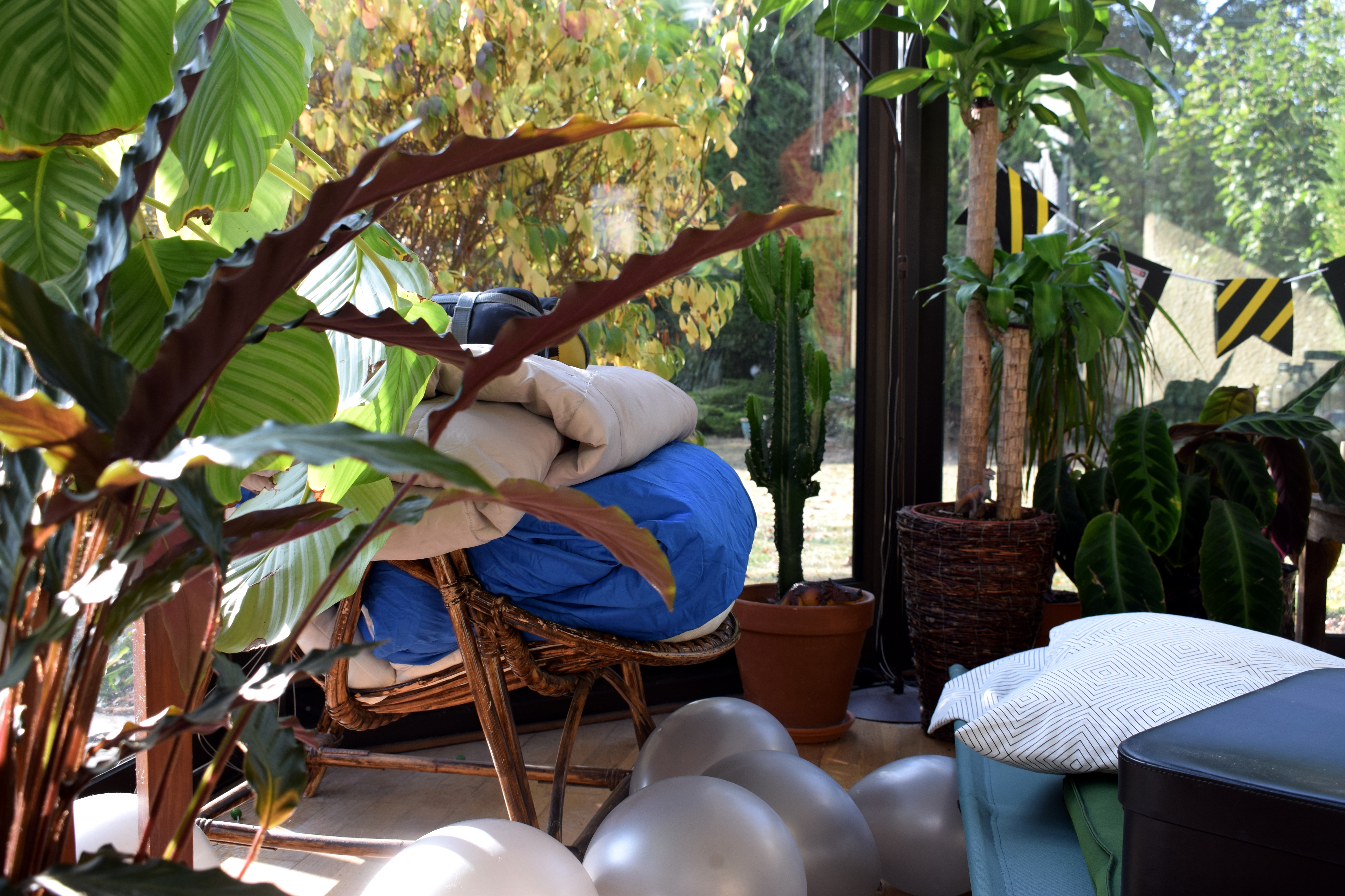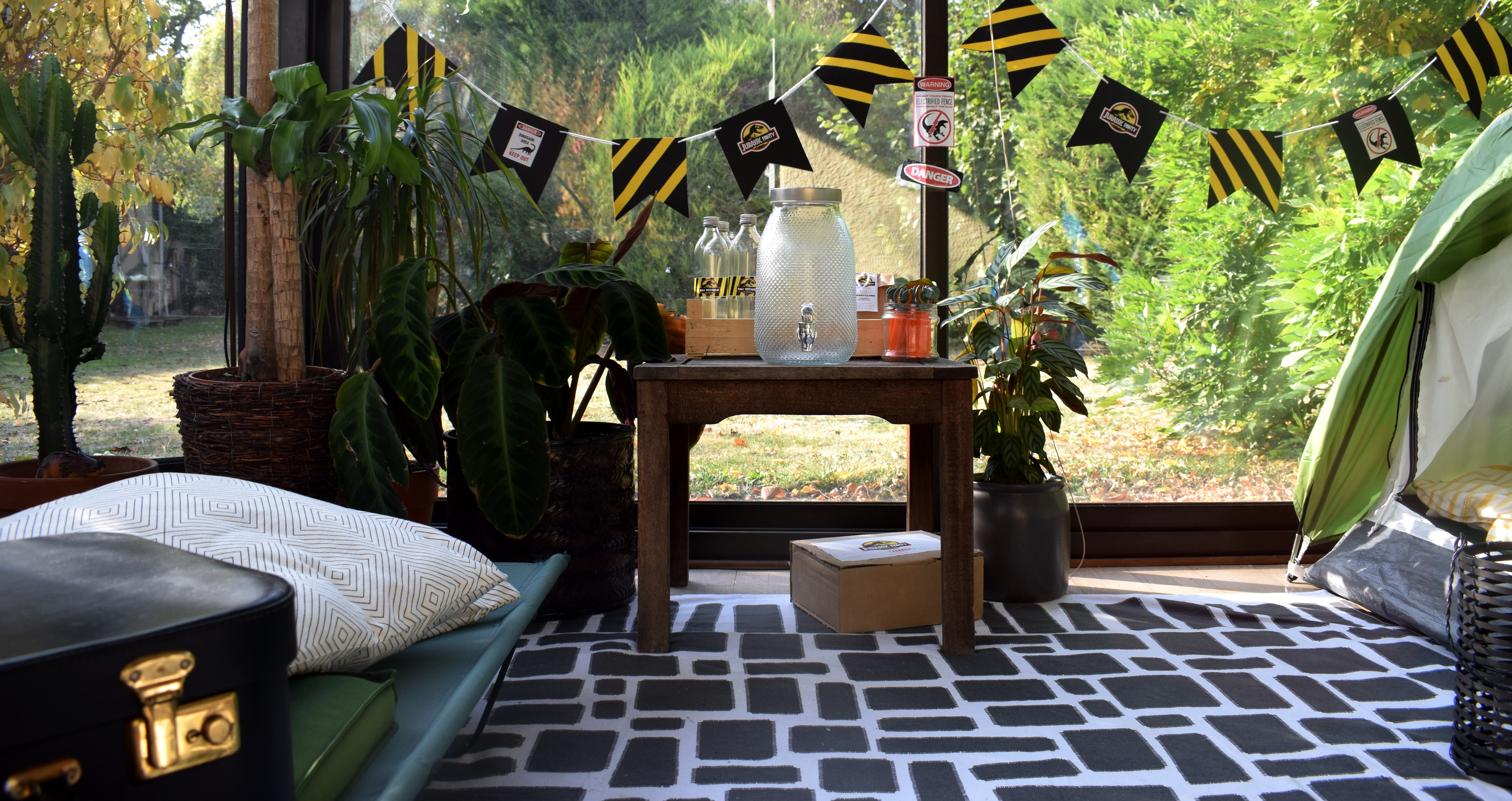 Un lit de camp et deux tentes kaki + des coussins pour la touche cosy + une bonne dose de plantes pour rester dans le vert + une étoffe graphique que j’utilise toujours comme nappe de pique-nique = ambiance Jurassic Camp, je pense, réussie.