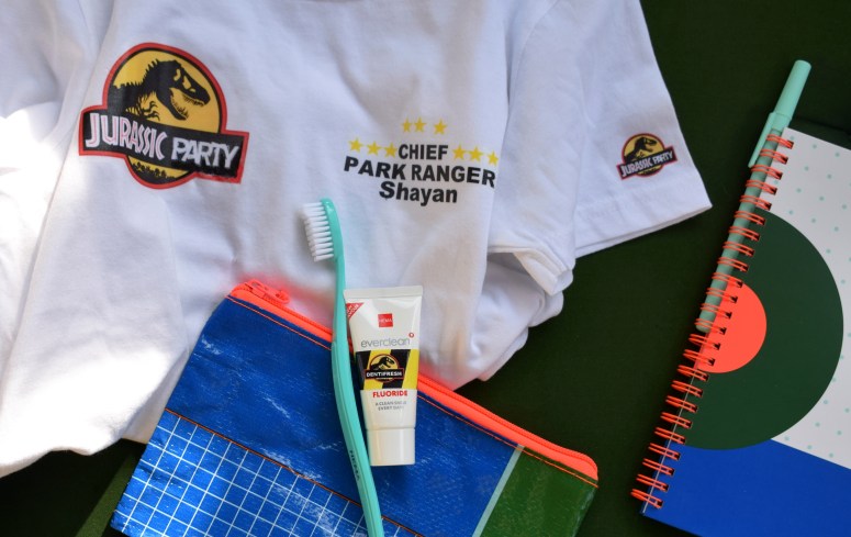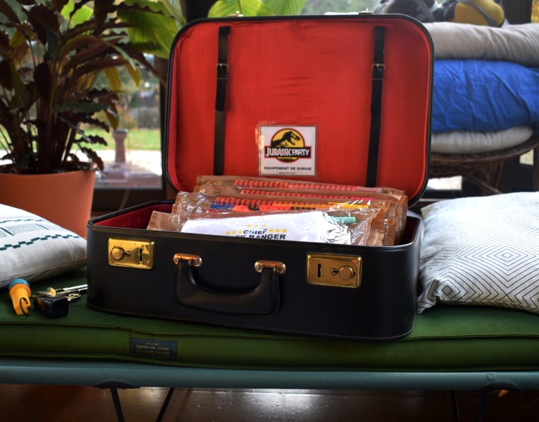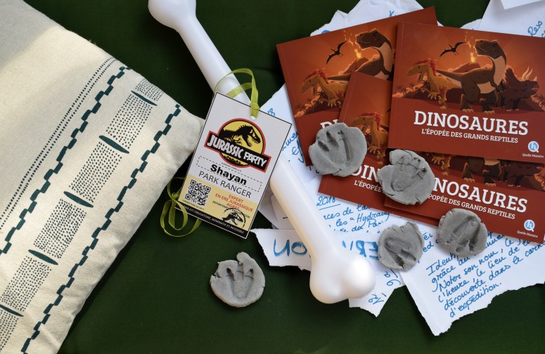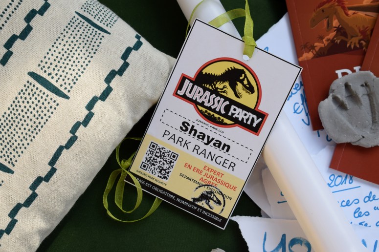 Ce kit de survie comprenait une trousse de toilette, avec dentifrice et brosse à dents, pour une bonne hygiène dentaire et éviter d’avoir une haleine de T-rex [c’est important] + un carnet et stylo avec toutes les infos nécessaires au bon déroulement de l’expédition et pour pouvoir également noter les références de tous les échantillons collectés + un tee-shirt de la Jurassic Party personnalisé à son nom, réalisé à l’aide de papier transfert + un petit livre sur les Dinosaures [de la collection Quelle Histoire que j’adore] pour pouvoir identifier chaque specimen de dinosaures trouvés + le pass nominatif du Park Ranger, reçu par courrier lors de la convocation à cette expédition.