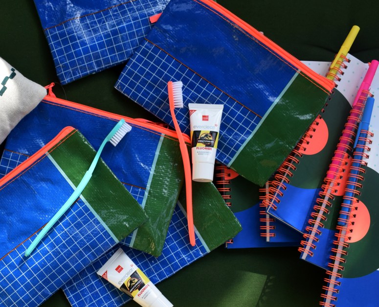 // trousses de toilette, tubes de dentifrice et brosses à dents, carnets et stylos achetés encore une fois chez Hema – tee-shirts blancs achetés chez Kiabi – petits livres Dinosaures achetés sur Amazon //
