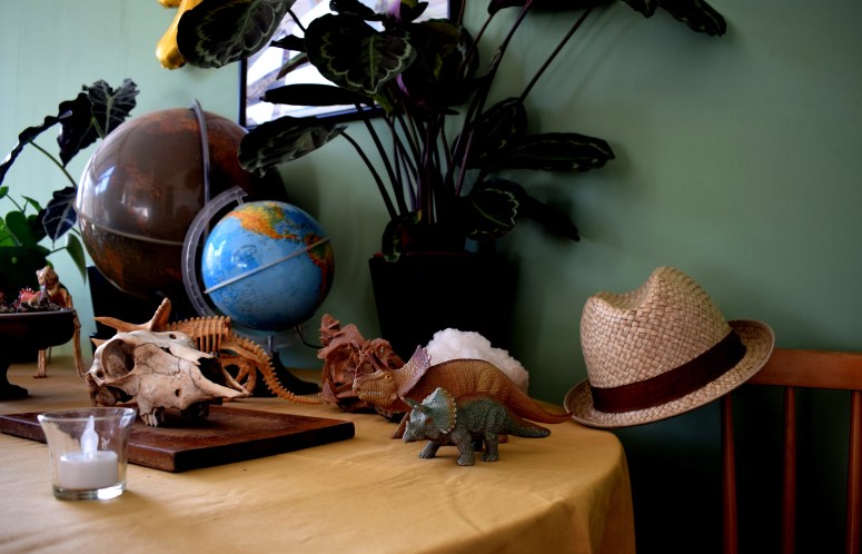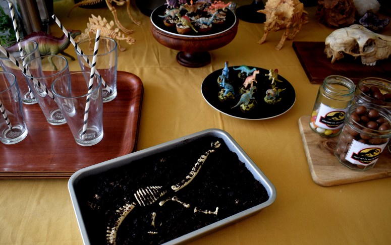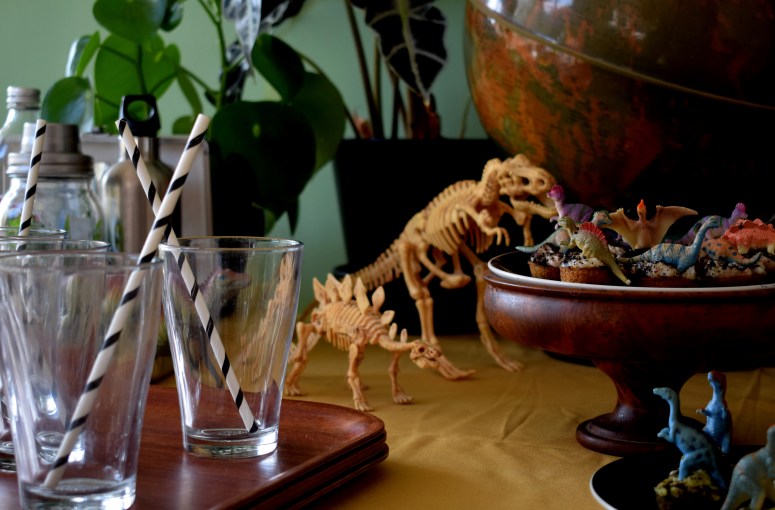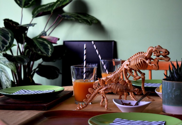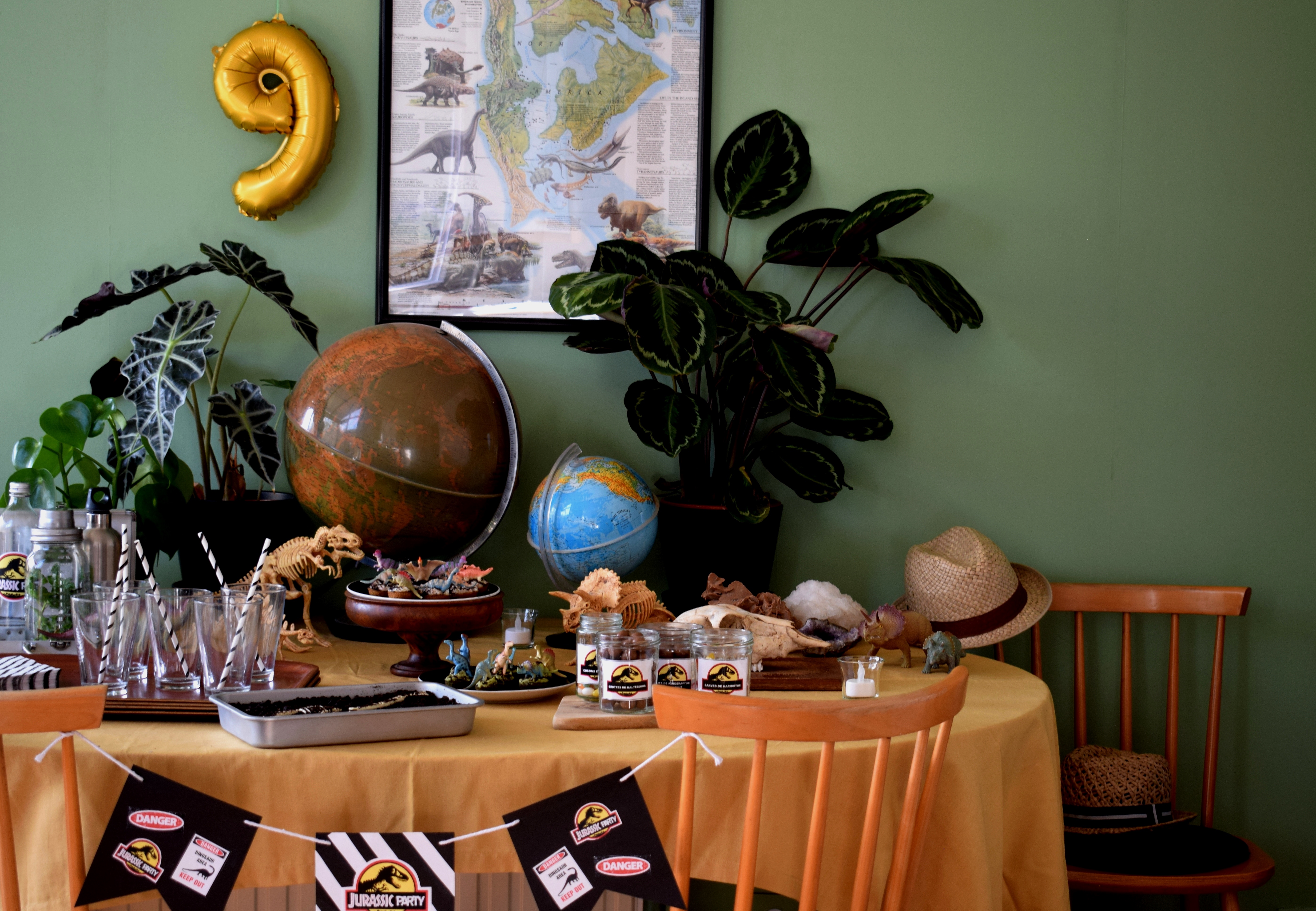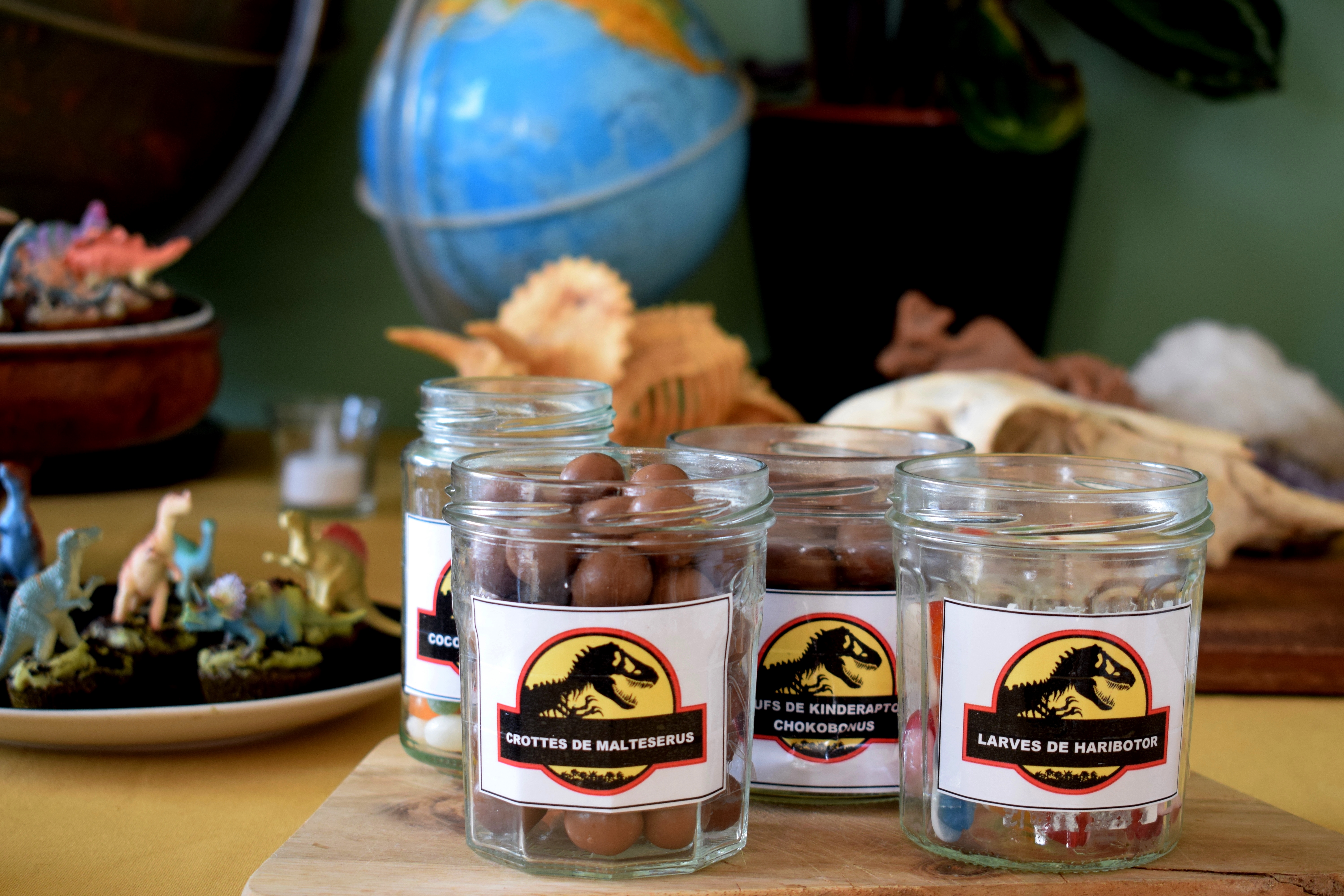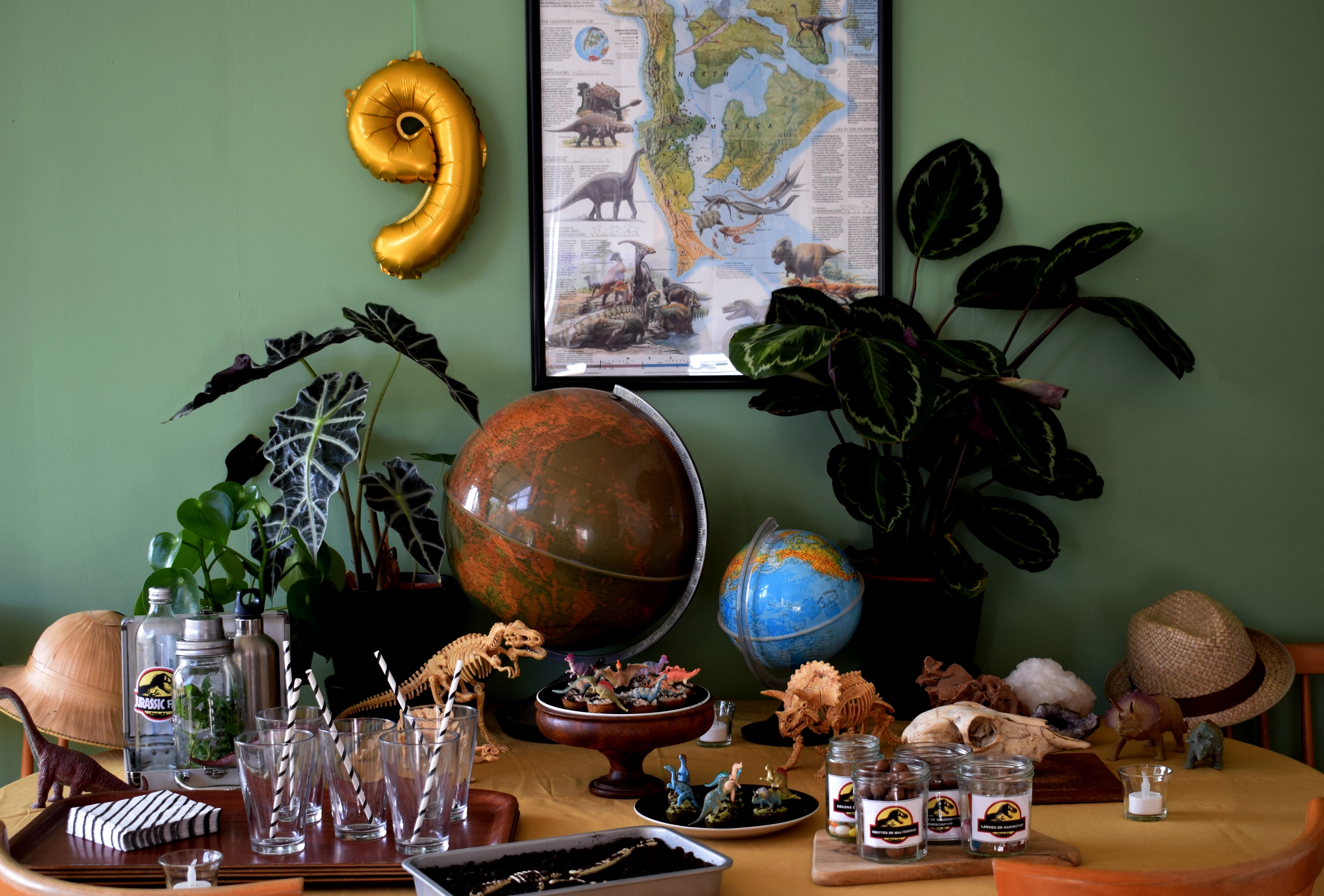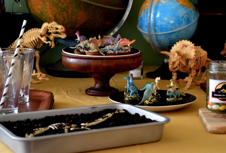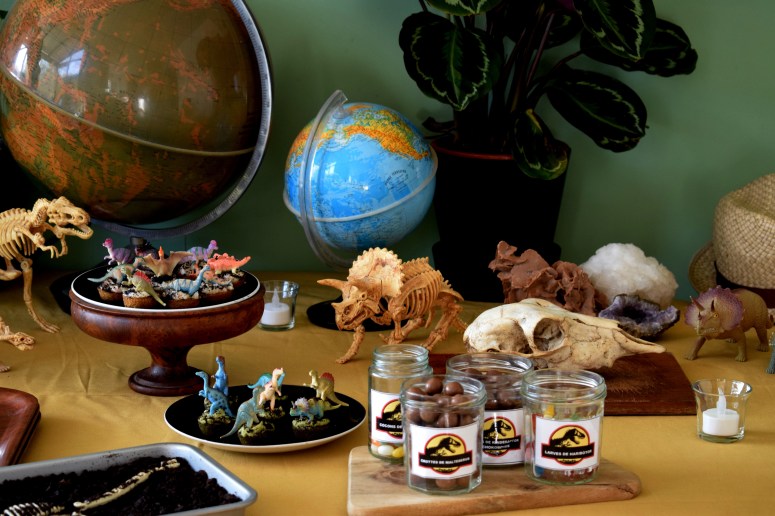 Cadre, plantes, dinos, globes, pierres, gâteaux, gourmandises, crâne, chapeaux, banderole et encore dinos … Un pti mélange sauvage pour des enfants bien gourmands mais sages.