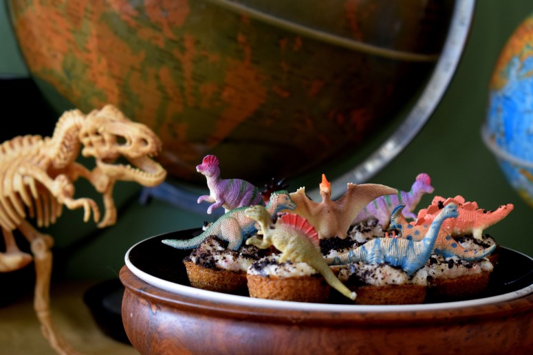 En plus du gâteau, j’avais confectionné des mini carrot cupcakes [le carrot cake étant MA spécialité et un de mes préférés], nappés de mascarpone nature + des minis cupcakes au chocolat, nappés mascarpone au matcha, le tout saupoudré encore une fois de miettes d’Oréo et orné de minis dinos colorés.
