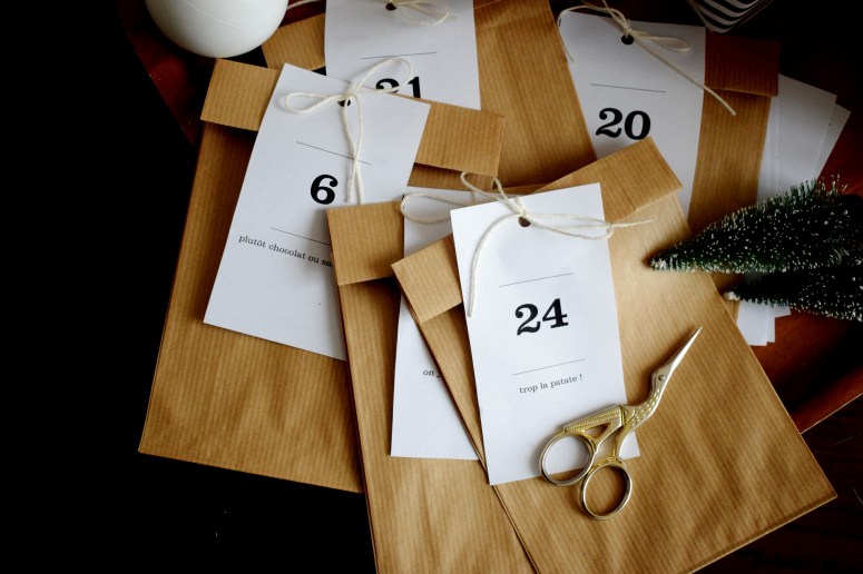 Allez hop ! Il ne reste plus qu’à remplir les pochettes de gourmandises en chocolat, de les suspendre à un fil à la mode guirlande, d’attendre avec impatience dimanche 1er décembre et de découvrir les messages et surprises le matin au réveil … et puis voilà !