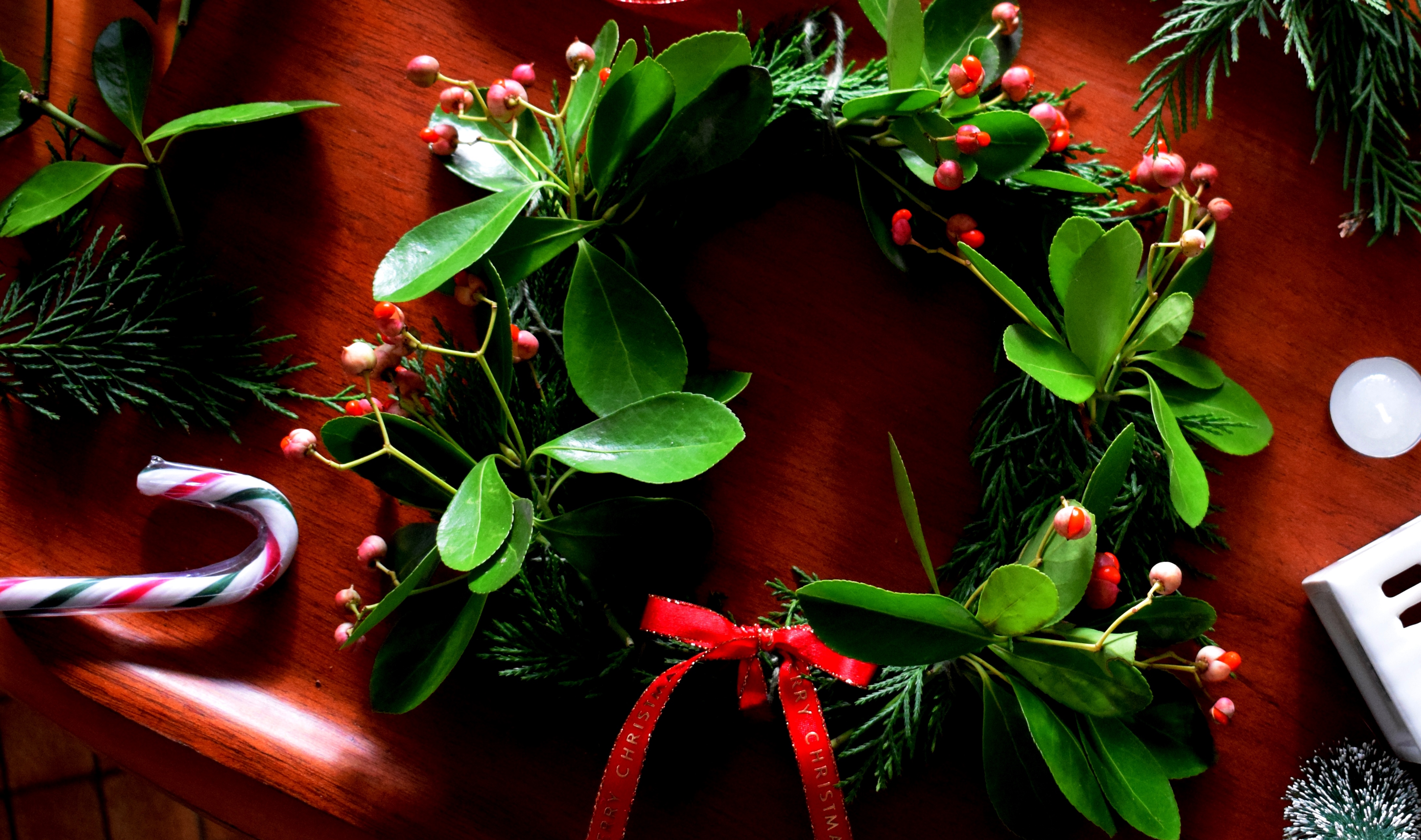 3) Insérer les petites branches de boules rouges ici et là sous la ficelle