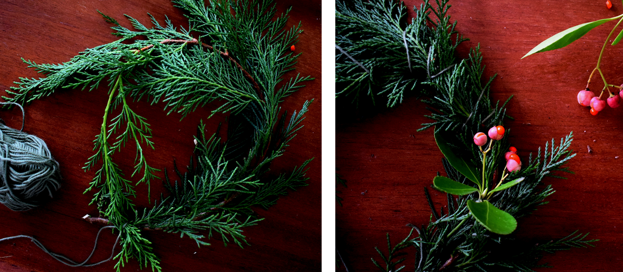 1) Prendre la plus longue branche de thuya et rejoindre les 2 bouts avec de la ficelle