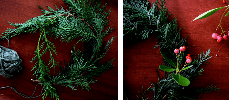 2) Superposer les autres branches de thuya et les enrouler de ficelle